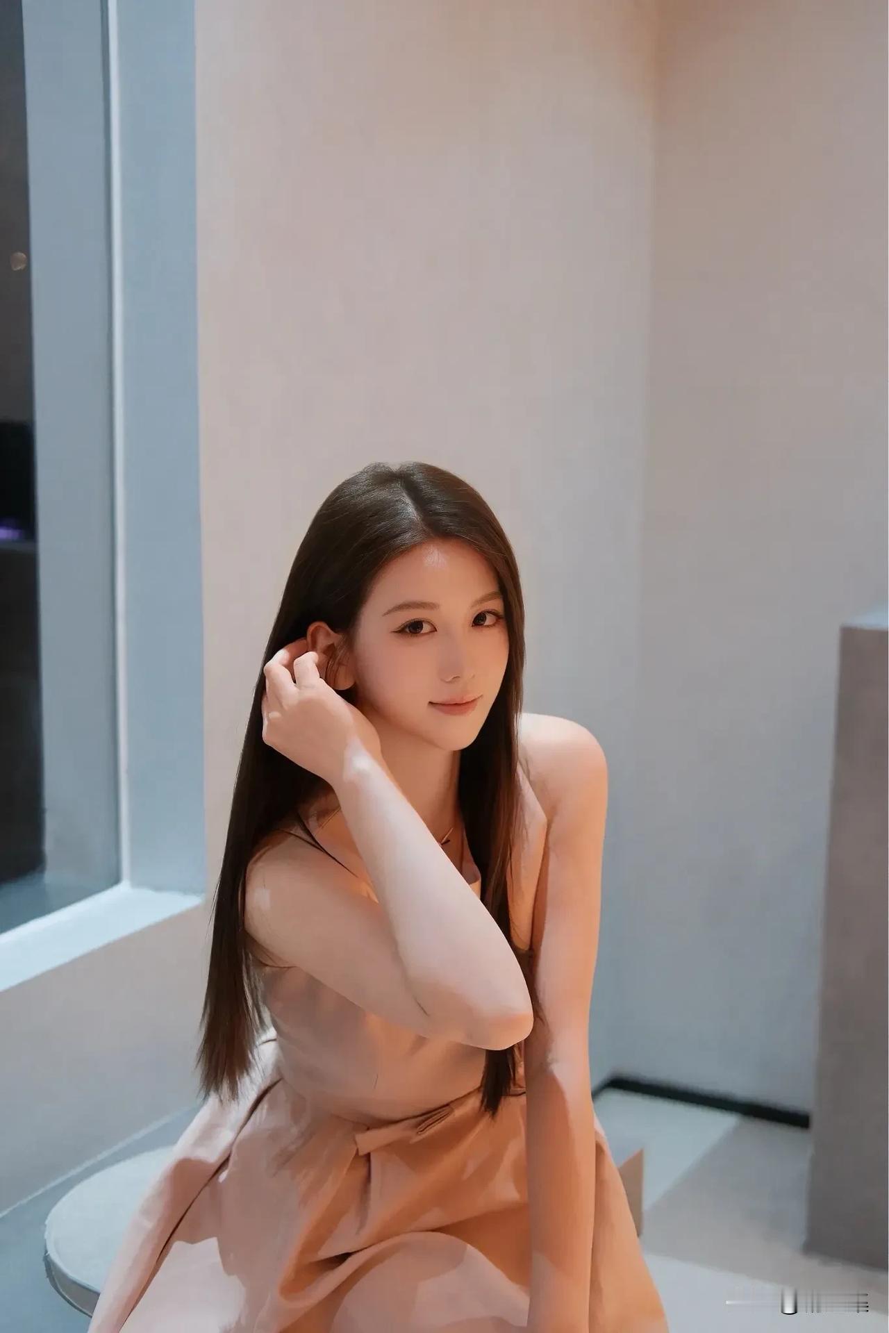 温柔甜美的少女,浅粉色连衣裙,微笑动人