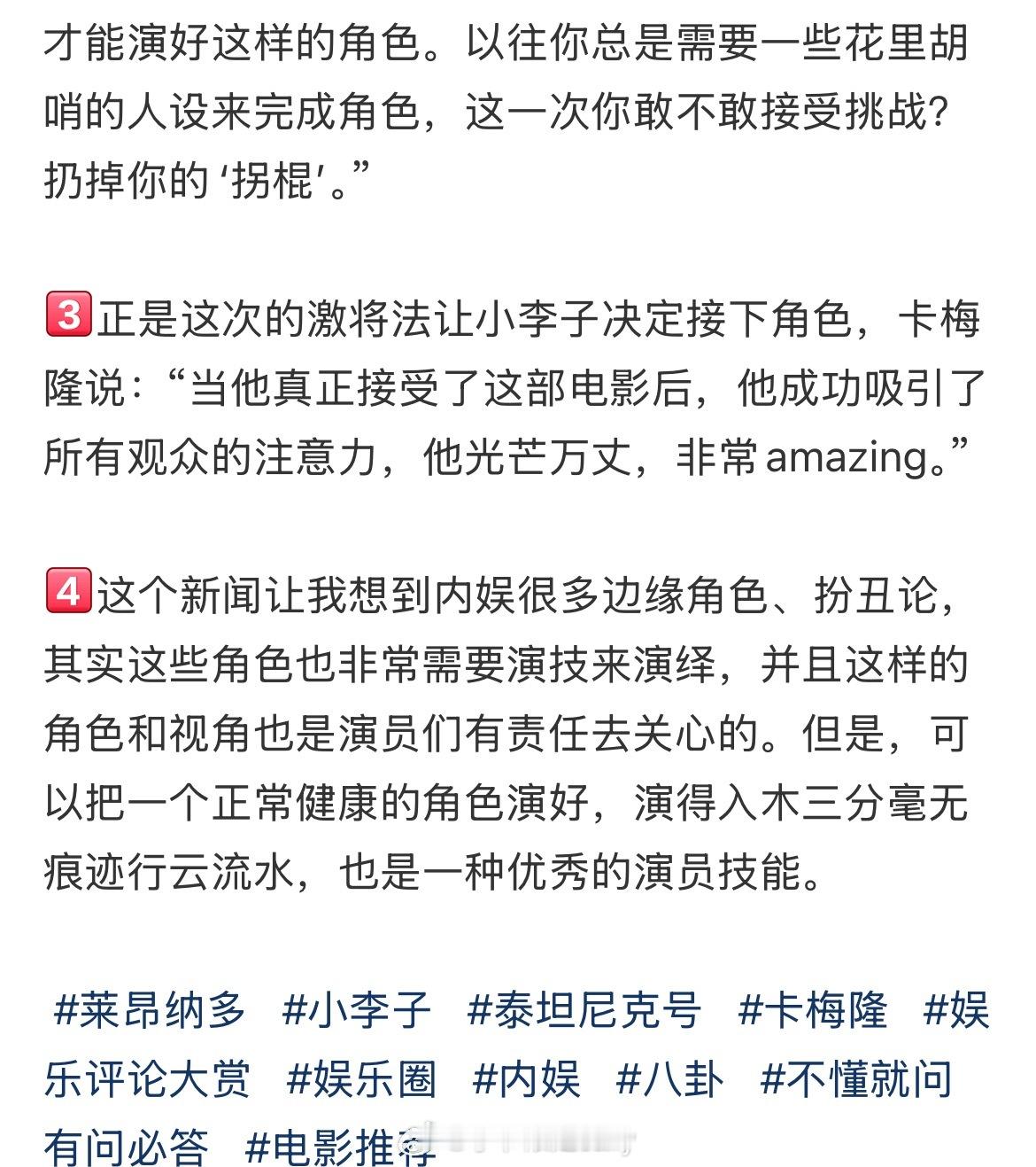 卡梅隆劝小李子演泰坦尼克号这段说得好诶:这样正常健康的角色才是最难驾驭的,只有最伟大的演员才能演好这样的角色。以往你总是需要一些花里胡哨的人设来完成角色,这一次你敢不敢接受挑战?扔掉你的‘拐棍’。”