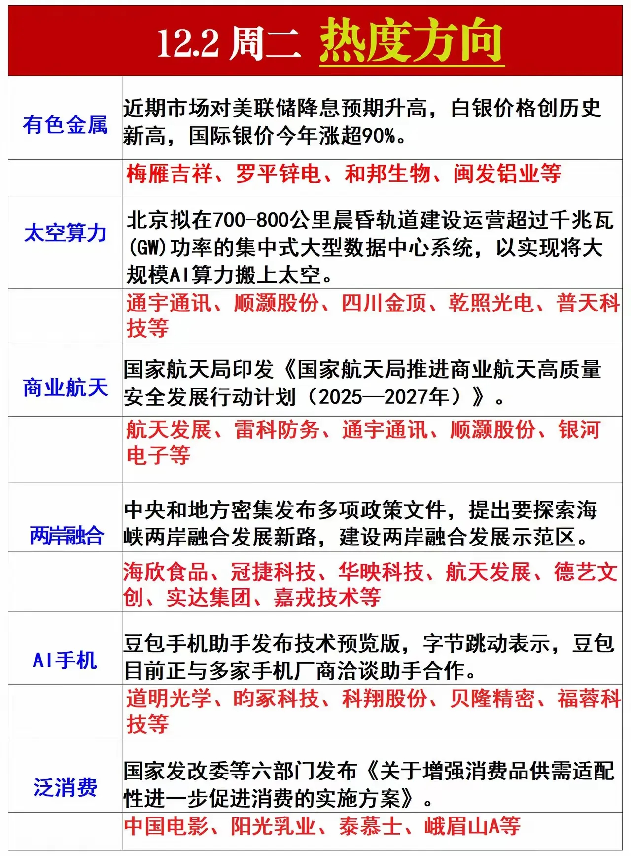 12月2日,周二,热门人气股推演 中兴通讯:跳空封板,空间打开北方稀土:量价配合,还有预期道明光学:跳空封板,还有空间航天发展:秒板封停,趋势未改海欣食品:四板晋级,稳握筹码江西铜业:封板未稳,慎防追高东方财富:破位下行,规避为好雷科防务:强势连板,主升延续国晟科技:新高封板,主升延续湖南白银:轮动切换,快进快出紫金矿业:中阳反弹,趋势向好乾照光电:溢价兑现,分批止盈天风证券:监管立案,暂避观望光启技术:跳空封板,有望晋级通宇通讯:一字三连,再接再厉梅雁吉祥:快速连板,安心持有峨眉山 :跳空首阳,整固将临冰山冷热:尾盘封板,谨防回撤平潭发展:连续上扬,不宜追入 特发信息:高位震荡,逢高减仓美格智能:长阳突破,空间打开四川金顶:冲高受阻,及时离场新华都 :十日支撑,短线反弹万通发展:阳线反包,维持看好郝美集团:长阳封板,趋势上行航天动力:高位震荡,静待回踩实达集团:二次涨停,滚动止盈昀冢科技:长阳突破,趋势上行工业富联:中途休整,暂观其变茂业商业:巨量开板,资金抢跑朝阳科技:长阳封板,突破空间中国电影:强势突破,继续格局海南瑞泽:中途十字,方向待明银河电子:一字封板,有望晋级山子高科:重聚动能,蓄势再起襄阳轴承:获利回吐,洗盘再上利君股份:跳空封板,还有空间天际股份:逢低布局,坚定持有航宇微 :放量长阳,持稳待涨赣锋锂业:小幅震荡,继续格局 以上仅个人观点,不作为任何投资依据!