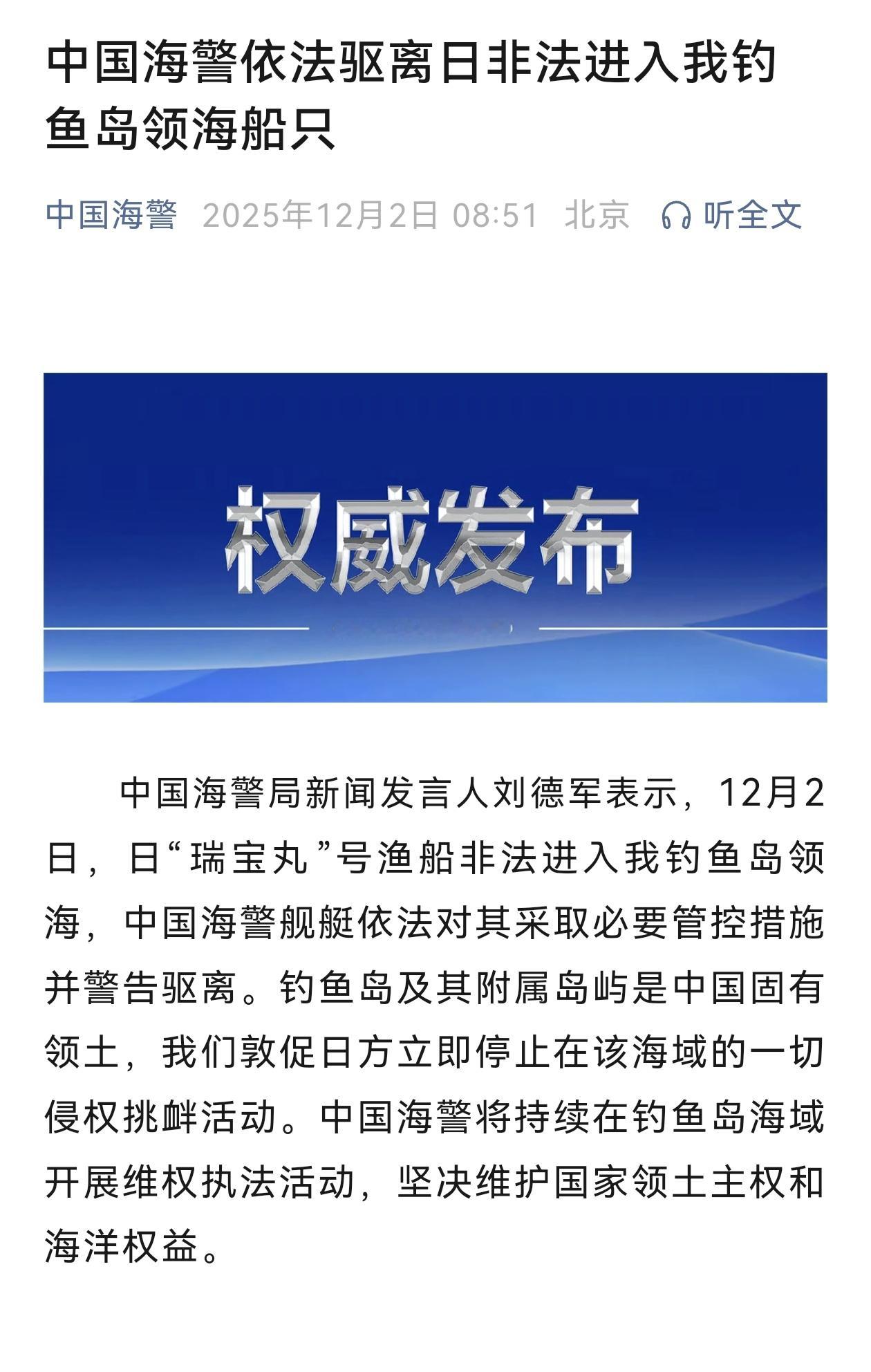 中国海警依法驱离日非法进入我钓鱼岛领海船只