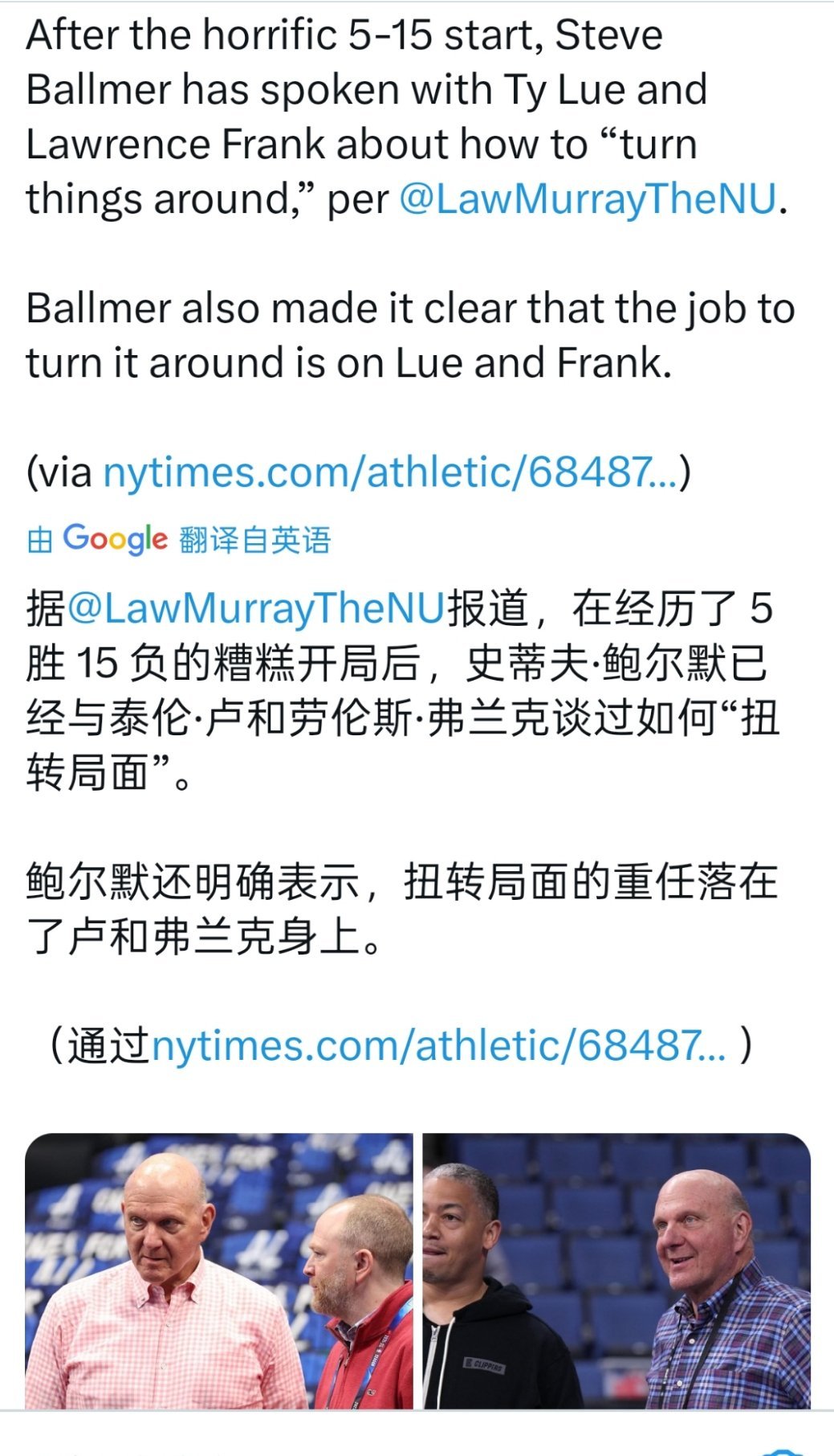 ▲经历了5胜15负的糟糕开局后,鲍尔默已经和卢,弗兰克谈过如果扭转局面,鲍尔默明