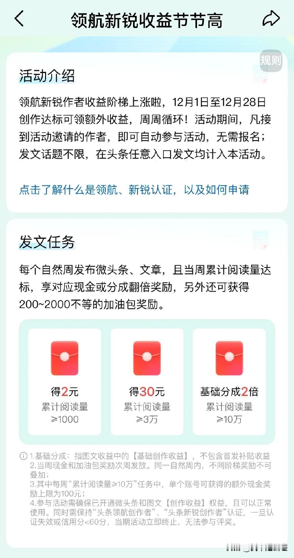心心念念的领航、新锐创作者新活动震撼来袭[玫瑰][玫瑰] 这次分了三个档次,结算方式还是以自然周为单位,共四周。 完成对应的阅读量之后,就有相应的奖励,并且还有加油包的加持。 最重要的是阅读大于10万那个档位,底下小字做了说明,对于基础分成2倍这个,最高兑换奖励是100元。 需要注意的是,此活动在自然周累计阅读量,奖励不累计,只对应完成情况进行奖励。 而且这次只要收到活动通知,即视为参加了,无需再次报名! 还在犹豫什么?加油吧,友友们!!