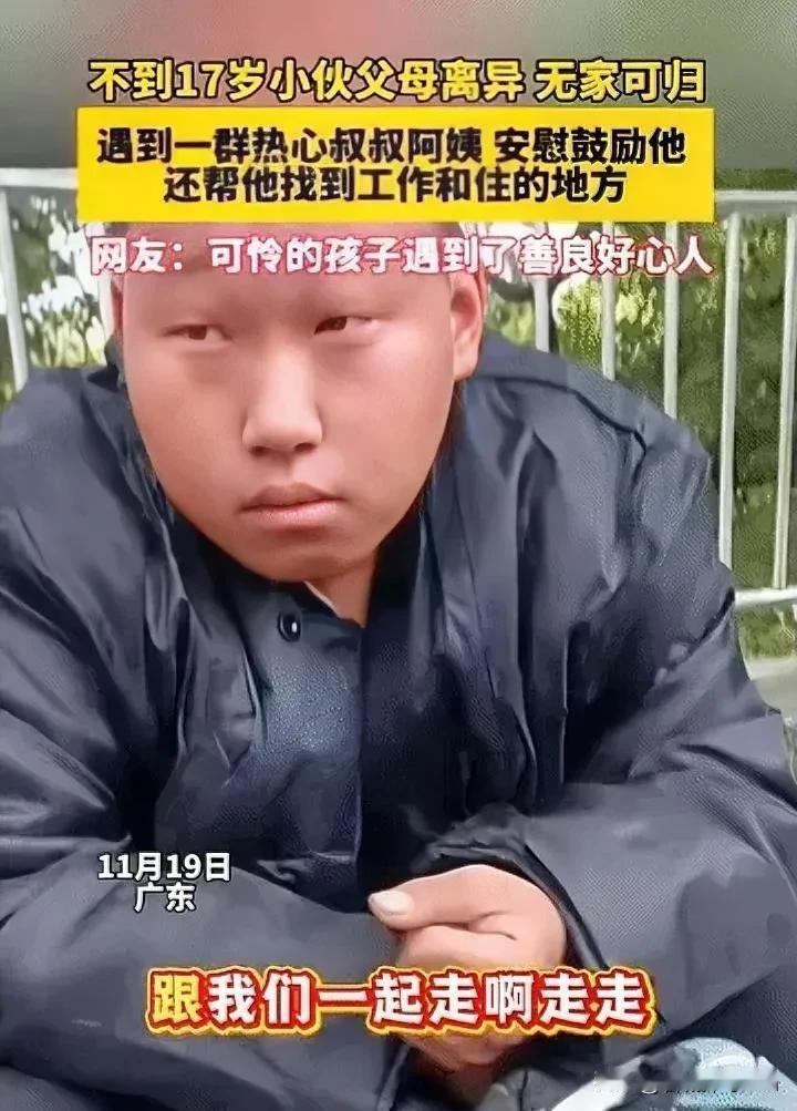 网友感动了:广东,不到17岁的男孩父母离异,没有一个愿意要他,他无家可归只能坐在街边一脸的无措和绝望,天大地大竟然没有他的容身之处!来往不少人看到男孩独自一人坐在那里,就上前询问他是不是遇到困难了。 男孩一开始没敢说话,头埋得低低的——之前遇到过路人搭讪,要么是随口问问就走,要么是带着打量的眼神,他早攒了一肚子防备。 直到有个穿碎花围裙的阿姨递过来一个热乎的肉包,说“天儿这么冷,先吃点东西暖身子”,他才抬了抬眼,声音哑着挤出来几句话: 父母离婚后各自成了家,都嫌他是累赘,说“跟着谁都不方便”,他从老家偷偷跟同乡来广东找表叔,结果表叔换了地址联系不上,身上的钱花光了,已经在街边蹲了三天,晚上裹着捡来的破外套睡公交站长椅,连口热乎水都没喝过。 围过来的人越听越揪心。有个开五金店的叔叔掏出手机,翻着通讯录念叨“我认识街口小吃店的老陈,人实诚,最近正缺帮手”,拨通电话就直截了当:“老陈,这儿有个娃,不到17,没地方去,你那儿能不能管口饭,让他帮着择菜收拾? 这娃看着老实,不会添乱。”没等老板多犹豫,旁边的阿姨接话:“要是工资少点没事儿,我们常去你那儿吃饭,帮你多带点生意。” 挂了电话没十分钟,小吃店老板就骑着电动车过来了,上下打量了男孩一眼,说“跟我走吧,活儿不重,管三顿饭,晚上睡后厨隔间,铺盖我给你找”。 男孩跟着老板走的时候,脚都有点打颤——他没想到真有人会管他的死活。到了小吃店,老板先端来一碗热汤面,卧了两个鸡蛋,男孩拿着筷子的手直抖,扒拉了两口就埋头哭了,眼泪掉在碗里,他也没顾上擦。 等吃完面,老板把他领到后厨的小隔间,指着刚铺好的被褥说“以后这儿就是你屋,锁是新换的,放心睡”,又递过来一套干净的旧衣服:“是我侄子以前穿的,差不多合身,先凑活着穿。” 第二天早起,男孩跟着老板擦桌子、择菜,手脚麻利得很,客人多的时候还会帮忙端盘子,老板夸他“眼里有活儿”,他就红着脸笑。 之前围过来的那几个叔叔阿姨,常借着吃饭的由头过来看看,有的带袋水果,有的塞件厚外套,有个在社区上班的阿姨,特意跑过来问清楚男孩的老家地址,联系了当地居委会,又拨通他父母的电话,把法律里的抚养义务一条一条说清楚:“不管你们过成啥样,娃是你们的,抚养费得给,以后也得管他的事儿,不能说扔就扔。” 男孩后来跟人说,那天坐在街边的时候,觉得自己像被风吹走的纸片,哪儿都落不下。是那口热包子、那碗汤面,还有那句“跟我走吧”,把他从飘着的地方拽了下来。 他知道自己现在的活儿不算轻松,但每天能吃热饭、能睡安稳觉,老板还说等他满了18,教他做小吃的手艺,以后能自己撑个小摊子,这就够了。 没人能替男孩原谅父母的不管不顾——离异不是甩脱孩子的理由,那些“不方便”的借口,说到底是不肯担起该担的责任。可这群素不相识的人,没讲啥大道理,只凭着“这娃可怜”的心思,就搭了把手,把他从绝望里拉了出来。 这份善意不是偶然的,是普通人心里藏着的暖,知道半大的孩子不能没人管,知道天大地大,总得给想好好活着的人留个容身的地方。 只是这暖里也透着点酸:本该由家庭兜住的孩子,却要靠陌生人的善意来安稳。好在善意没缺席,好在还有人记得,每个没处落脚的孩子,都该被拉一把,都该有个能好好长大的机会。 各位读者你们怎么看?欢迎在评论区讨论。