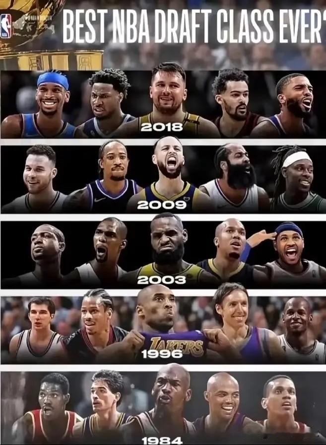 美媒评NBA历史上最强5大选秀大年,人才井湧: 1984年乔丹、巴克利等; 1996年科比、艾弗森等; 2003年詹姆斯、韦德等; 2009年库里、哈登等; 2018年亚历山大、东契奇等。