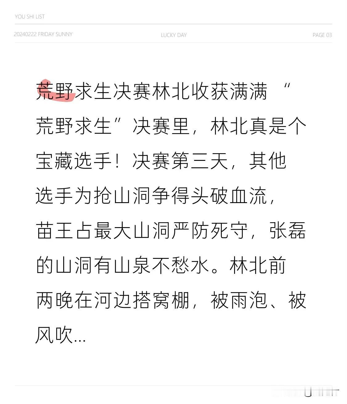 荒野求生决赛林北收获满满 荒野求生决赛林北收获满满 “荒野求生”决赛中 林北堪称宝藏选手 决赛第三天 其他选手为抢山洞打得头破血流 苗王占最大山洞严防死守 张磊的山洞有山泉不愁水 林北前两晚在河边搭窝棚 被雨泡、被风吹 遭网友质疑 可他每日观察山洞情况 第三天搬进去后 用石头堵缝隙、铺干草 把山洞改造得极为舒适 这“捡漏式求生”玩得精妙 到了第七天 他在小溪沟抓螃蟹 一个半小时抓了四十八九只 喊着“吃不完 根本吃不完” 可惜爬山没带锅 回来还走错路 有螃蟹没锅 稍有遗憾 但收获依旧满满当当 荒野求生比赛中如何应对突发状况 你对荒野求生大赛的举办有何看法 荒野求生大赛的安全保障有多重要