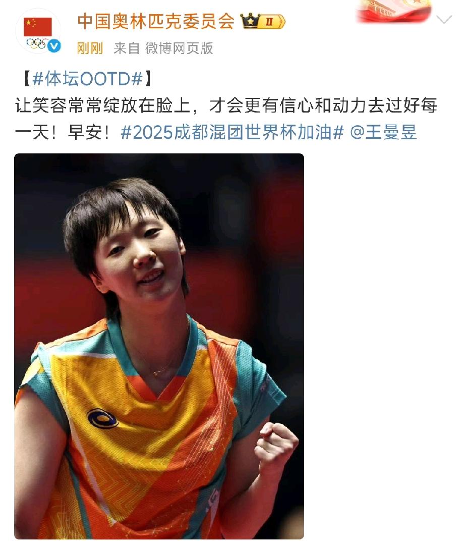 中国奥林匹克委员会今日更新王曼昱相关内容:让笑容常常绽放在脸上,才会更有信心和动力去过好每一天! 感谢中国奥林匹克委员会,看来今天王曼昱混团女单上场概率大大增加,过去几天,中国奥林匹克委员会都是每天按照当天上场选手更新相关内容。 球迷可以期待一下王曼昱今晚七点是否上场担任单打任务!为王曼昱加油!