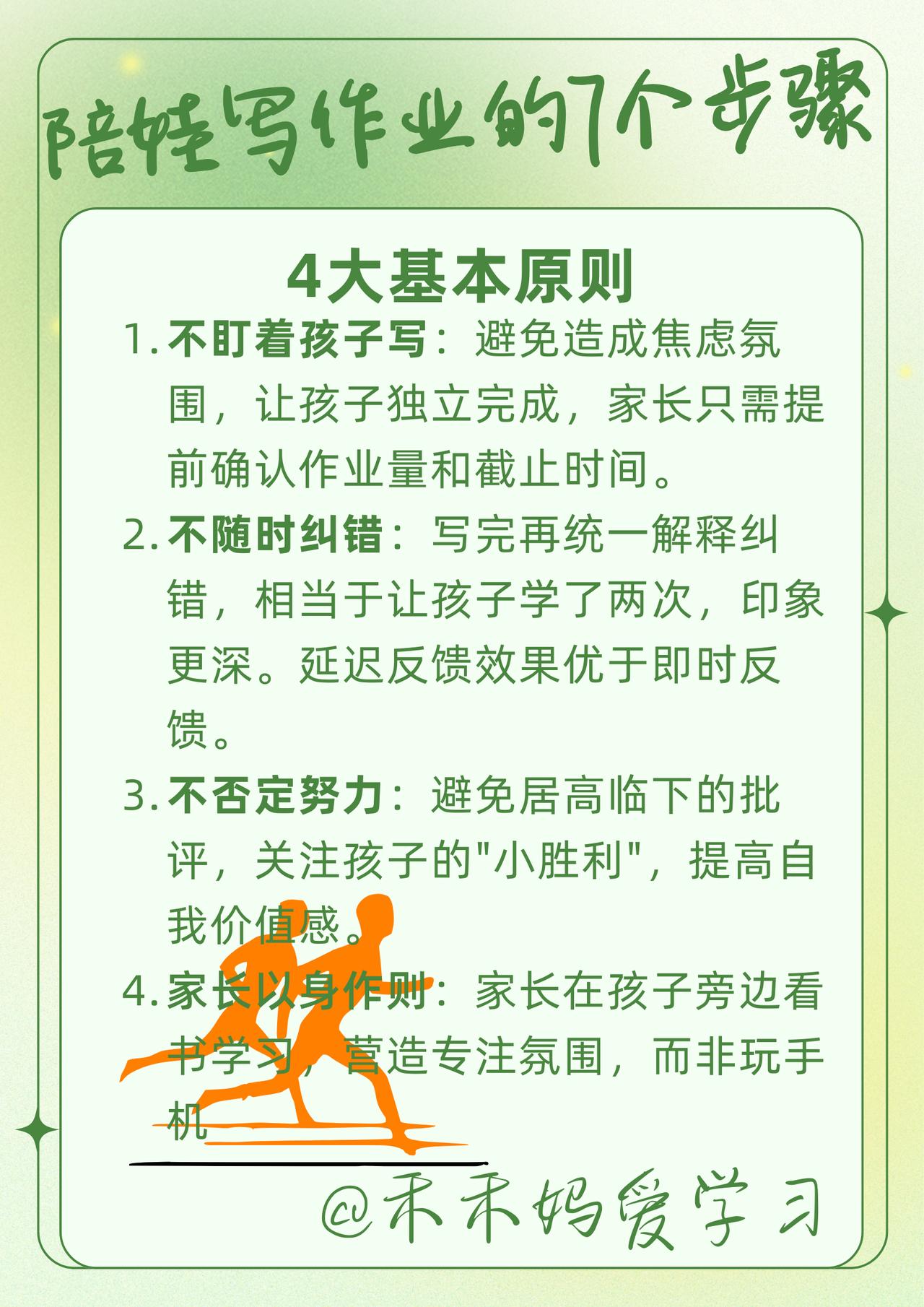 认识很多家长,为了图省事,孩子刚上小学一年级就把他放在托管班,看似很省事,实际上却为孩子未来学习习惯的培养挖了个大坑。 认识一位在重点小学担任二十年的老师,她说:辅导作业的底层逻辑不是为了监督和检查,而是随时关注孩子的心理。 把孩子放在托管班,家长确实能省心不少,但多数托管班老师辅导孩子写作业只能起到一个“监督者”的作用,然而,父母如果亲身去做这件事,就可以将这个角色转变为“陪伴者”和“引导者”,最终培养孩子独立自主的学习习惯。 目前公认最有效陪孩子写作业的7个步骤和4个原则分享给各位家长,建议家有中小学生的,尤其是低年级小学生的父母认真看一看,用这套方法坚持一个月,或许孩子就能给你带来意外惊喜。 家庭教育 育儿知识