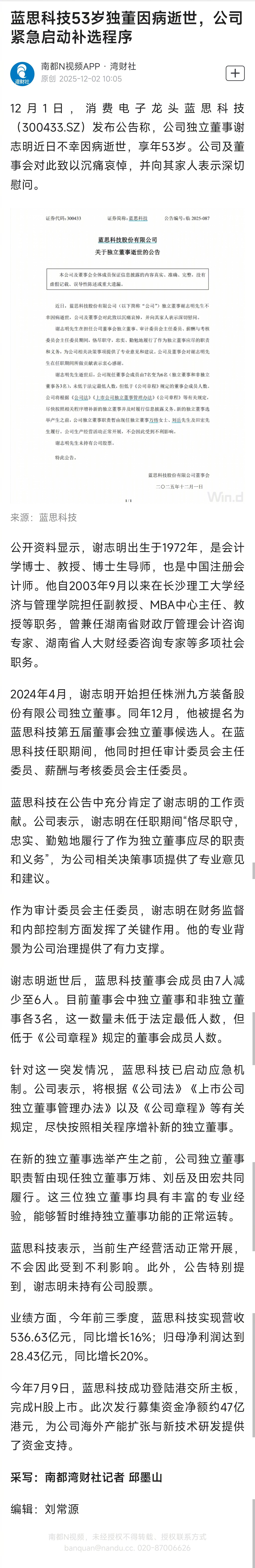 【#蓝思科技53岁独董因病逝世#,公司紧急启动补选程序】12月1日,消费电子龙头