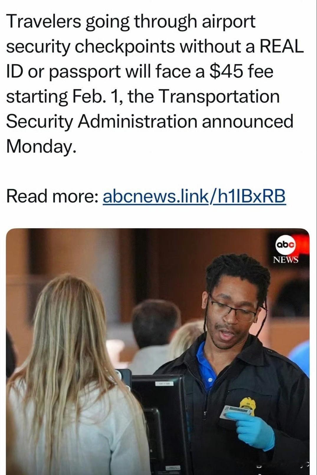 明年二月一日起,乘美国境内的国内航班,如果没有经特别认证的Real ID或护照,只有普通身份证或驾照,可以选择使用TSA的“Confirm.ID”服务来验证身份。 费用金额:使用此项服务的费用为 45美元。 Real ID指符合美国《真实身份法案》的身份证件,是联邦政府设定的统一安全标准,2025年5月7日起成为国内航班、联邦大楼等场所的重要身份证明。这类证件右上角会有星形标记作为联邦认证标识。 只要你现在持有的驾照带有Real ID标志,或者拥有护照等其他认可证件,2026年的这项新收费政策就与你无关,可以像往常一样正常乘机。