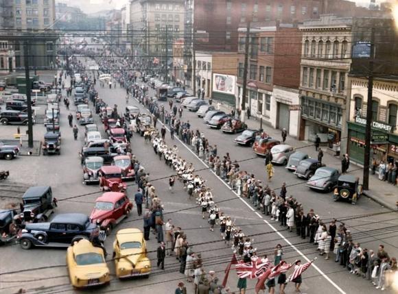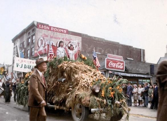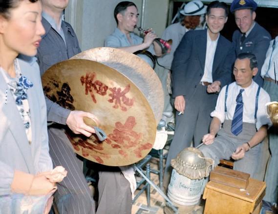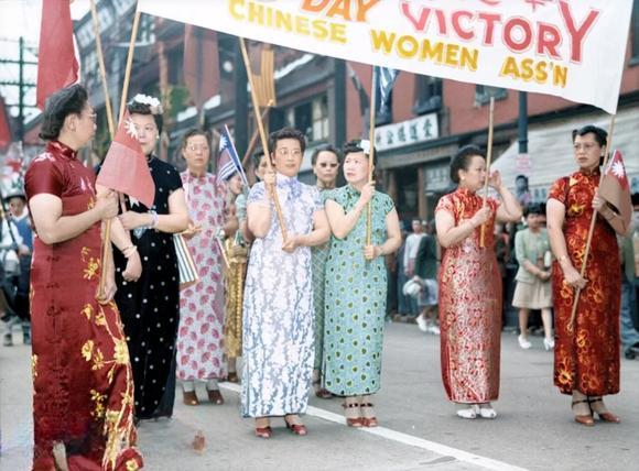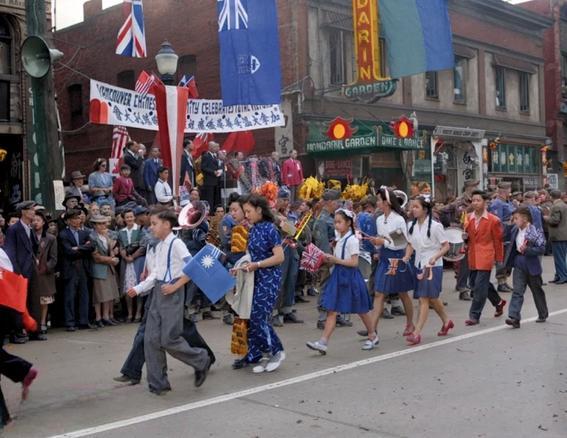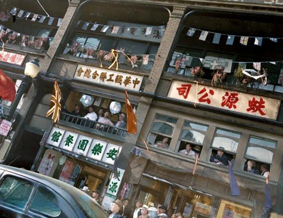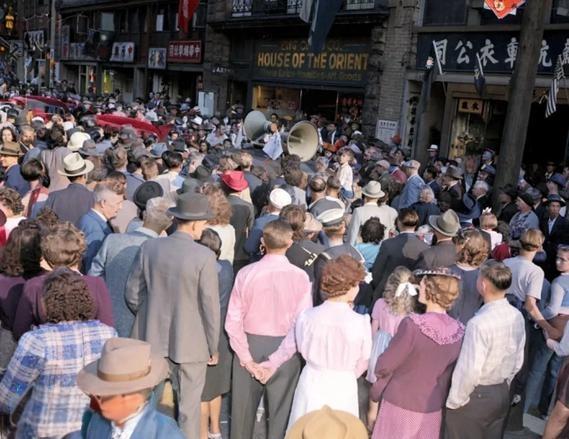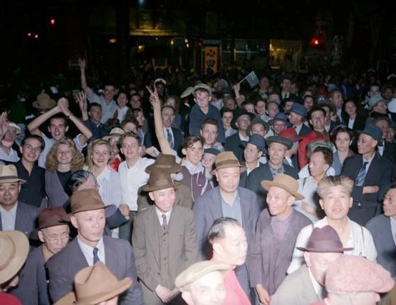 该组照片为1945年8月15日,日本投降后加拿大华侨在“温哥华”唐人街...