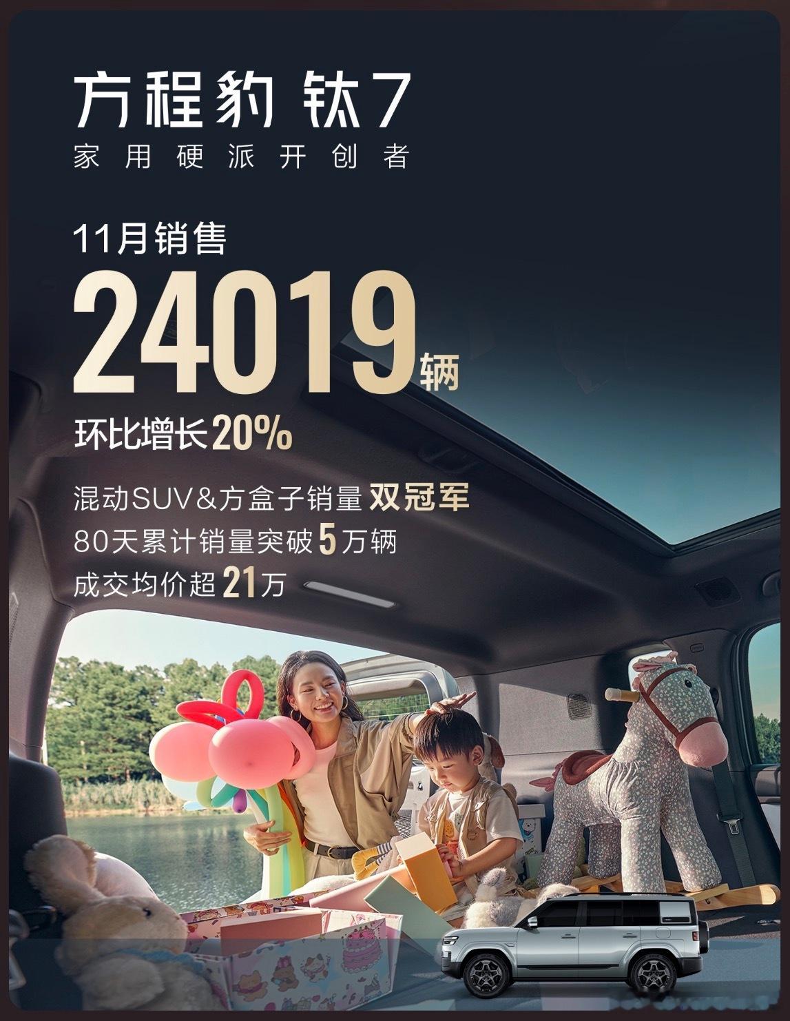 11月方程豹钛7卖了超过2.4w台,一台方盒子直接拿下来混动SUV销冠成交均价超21万,意味着顶配Ultra的销售占比非常高,也确实Ultra是最值得买的版本硬派越野比亚迪要吃一口,现在方盒子比亚迪上来就是一大口,做这两类车型的现在估计是很头大了方程豹钛7汽车销量新能源汽车