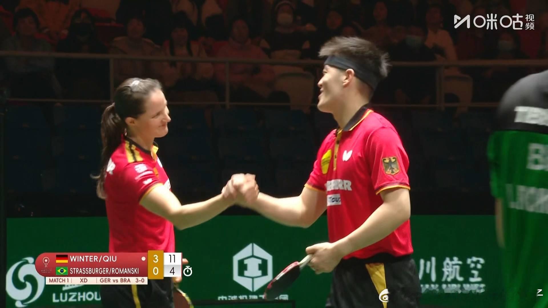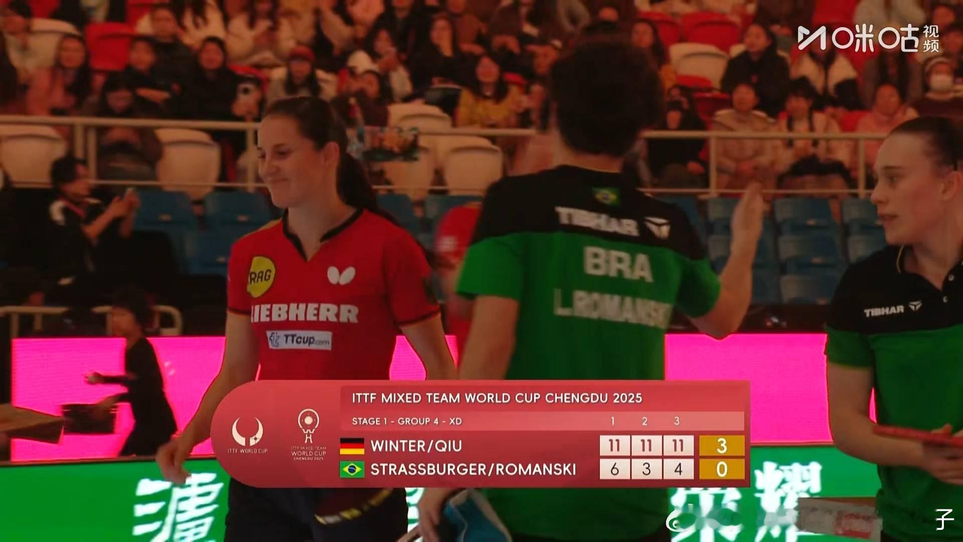 邱党温特3比2斯特拉斯伯格罗曼斯基(6,3,4)第二盘:尼娜VS劳拉渡边德国队三比零巴西队2025年国际乒联成都混合团体世界杯小组赛