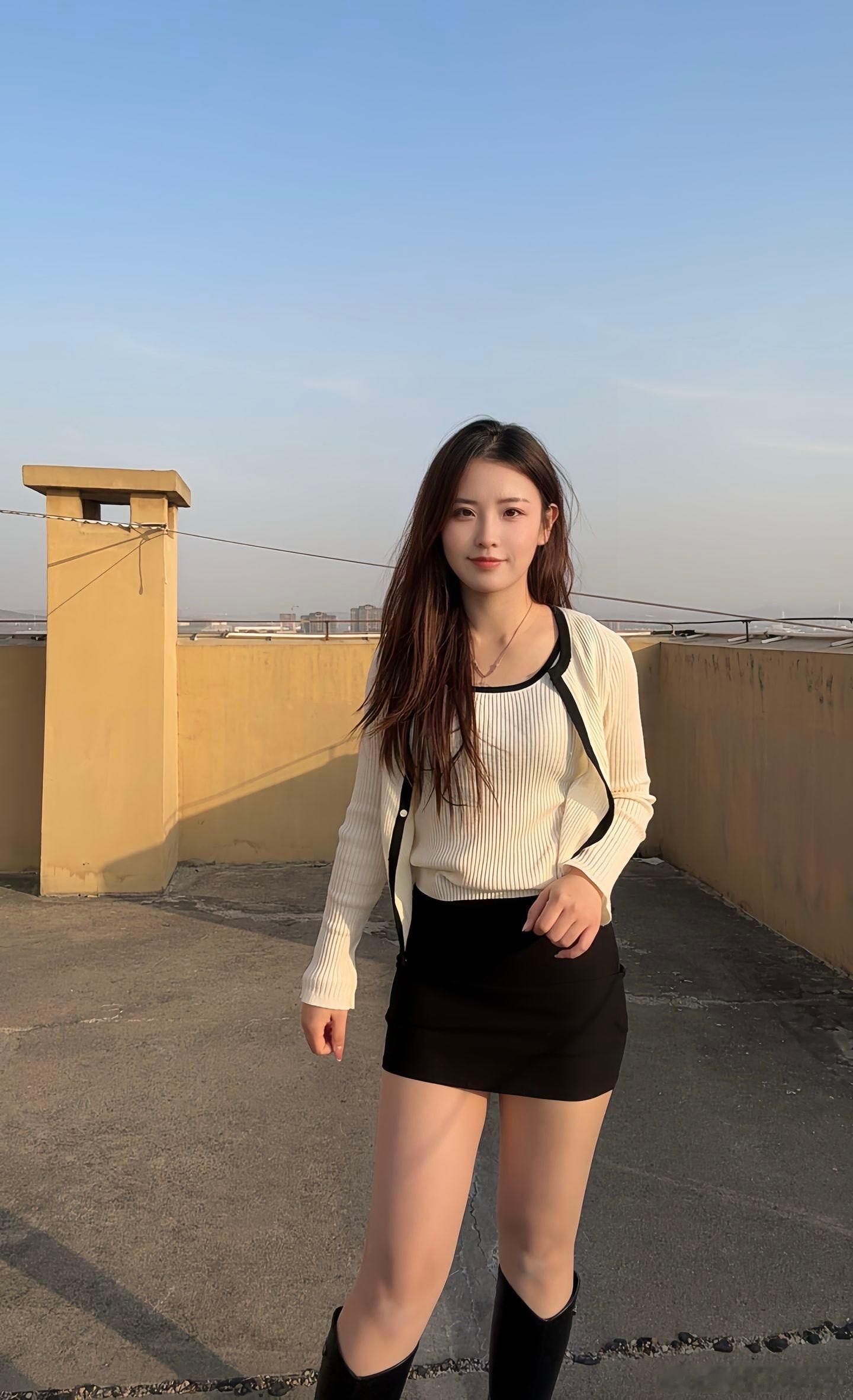 时尚穿搭 白色小开衫,配黑色短裙,长靴美女绘梦长廊邻家女孩