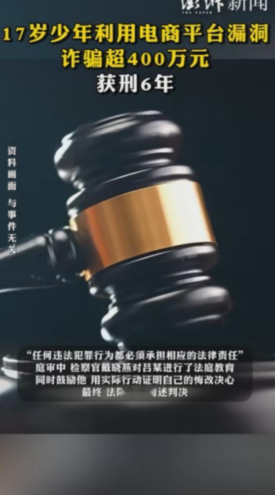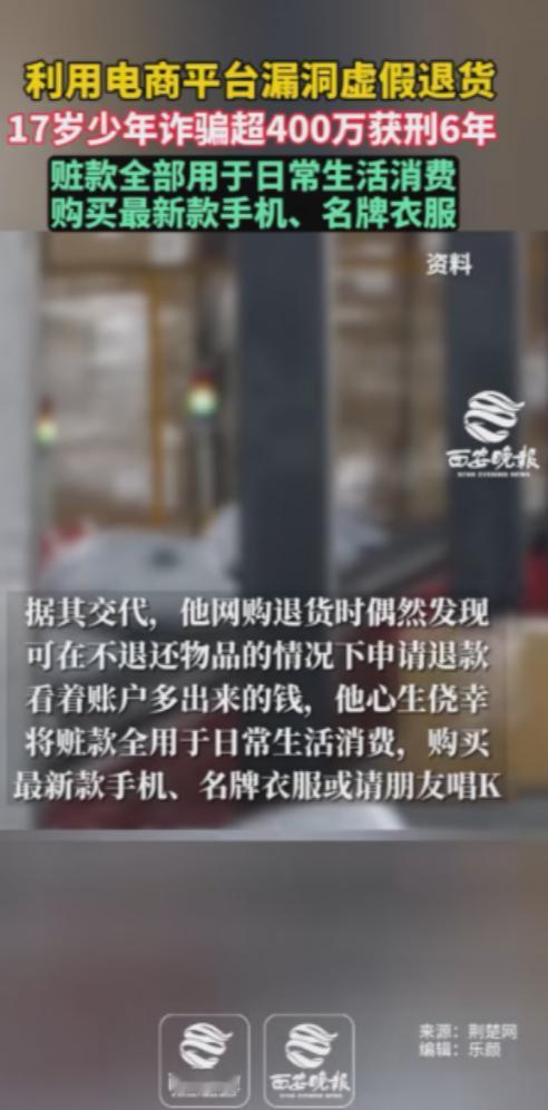 “聪明过头了!”上海,一男生在网购退货时,发现可以在不退还物品的情况下申请退款,于是就通过一系列措施骗取某化妆企业护肤品套装,涉案金额达400万余元,将赃款全都挥霍一空,最终,该男生被判处有期徒刑6年。网友:智商用错了地方! 这孩子姓吕当时在上海求学,平时也喜欢网购,有一次他买了护肤品后申请退货,无意间发现了一个 “漏洞”,就算不把实物退给商家,平台竟然也能通过退款审核,把钱原路退回。 换作普通人,发现这种情况可能会觉得是平台出错了,要么忽略要么主动告知商家,但吕某却动了歪心思,觉得这是个 “无本万利” 的赚钱捷径。 为了不被平台和商家发现,他还特意琢磨了一套 “操作流程”,不用自己的身份信息注册账号,而是去租赁别人的账号批量下单,专门选购高端护肤品套装。 下单后他不会真的把货物寄回商家,而是伪造虚假的物流单号,让平台误以为货物已经退回,等平台通过退款申请后,他就把截留的护肤品挂到二手交易平台上低价变现,一套流程走下来,钱来得又快又 “轻松”。 起初他可能还只是小打小闹,但看着钱这么容易到手,他彻底迷失了心智,开始大规模作案,短短一段时间里,他通过这种方式骗取的护肤品套装,涉案金额竟然高达 400 多万余元。 这些不义之财他没有用来改善生活,也没有存起来,而是全部用来挥霍,买名牌衣服、鞋子,天天请朋友去 KTV 唱歌、吃饭,出手阔绰得不像个高中生。 吕某来自一个多子女家庭,父母为了生计奔波,把他送到上海求学,却没能顾及到他的心理状态,独自在异乡的日子里,看着身边同学用名牌、过着光鲜的生活,他心里渐渐失衡,特别渴望被认同、被羡慕,而这笔来得容易的巨款,正好满足了他的虚荣心,让他在同龄人面前赚足了 “面子”,却忘了这些钱背后藏着的法律风险。 这种疯狂的日子并没有持续太久,2024 年 3 月那家化妆企业在核对后台数据时,发现大量订单存在 “只退款不退货” 的异常情况,涉案金额巨大赶紧报了警。 警方顺着物流信息、账号租赁记录等线索一查,很快就锁定了吕某,当警察找到他的时候,他骗来的 400 多万早就被挥霍一空,一分钱都没剩下。 面对警方的讯问,吕某才彻底慌了神,表现出了极度的后悔,还天真地表示愿意凑钱退赔,但法律可不是儿戏,400 多万的涉案金额,已经远远超出了普通诈骗的范畴,构成了严重的诈骗罪,尽管他还未成年,但鉴于涉案金额巨大、情节严重,法院审理后,最终判处他有期徒刑 6 年。 消息传开后,网友们都议论纷纷,惋惜之情溢于言表,有人说 “这孩子太聪明了,可惜聪明没用到正道上”,也有人说 “400 多万啊,要是用在学习上,考个好大学、找份好工作,将来什么挣不到,偏偏要走歪路”,还有人说 “现在的孩子怎么这么贪慕虚荣,为了一时的风光,把自己的青春都搭进去了,太不值了”。 不管脑子多灵活,都不能碰法律的红线。平台的漏洞不是用来钻的,不义之财也终究留不住,对于青少年来说,树立正确的价值观比什么都重要,想要得到认可、过上好生活,只能靠自己的努力和奋斗,走歪门邪道的结果,只能是自食恶果。 (信息来源:《17岁少年利用电商平台漏洞诈骗超400万元,获刑6年》澎湃新闻)