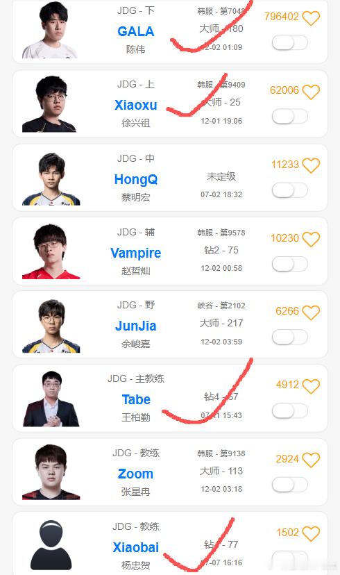 目前JDG新赛季阵容已经集结完毕:上单Xiaoxu、打野Junjia、中单HongQ、下路GALA、辅助Vampire,主教练Tabe、教练Xiaobai。其中四人曾效力于RNG,他们分别是上单Xiaoxu、下路Gala、主教练Tabe、教练Xiaobai,其中Xiaoxu是JDG从RNG接出来的,所以对老东格外忠诚,有知遇之恩,Tangyuan就有点尬住了,合同还在RNG,听说不便宜。JDG四人曾效力于RNGGala回复iGACG优创官