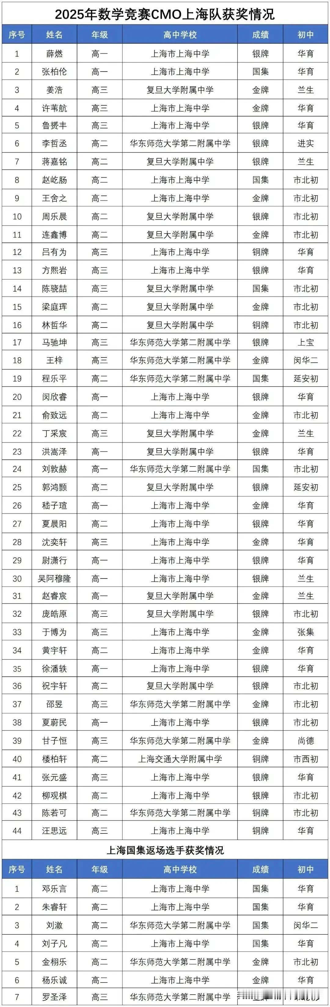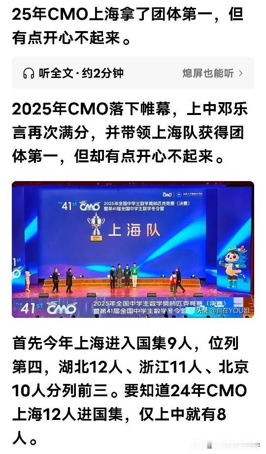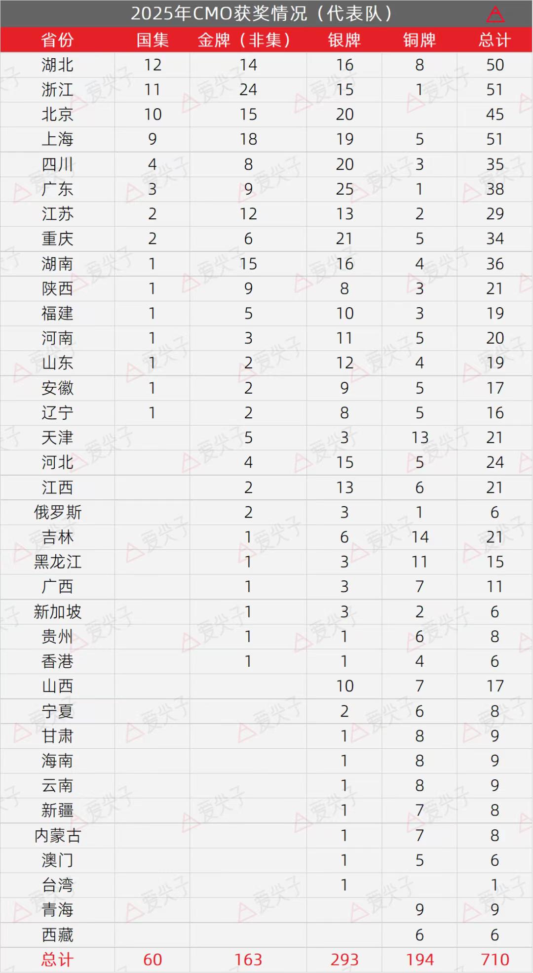 满屏的都是上海2025年CMO退步了, 人家上海都全国总分第一还退步了, 难道就是没有国集总数第一就是退步么? 说这话的都是哪些大神这么大言不惭! 如今的数学竞赛竞争已经越来越白热化了, 87分国集分数线同分的可以达到几十人, 84-87分这个区间有100多人, 最后就是靠着不同题的难度加权系数, 来人为的区分谁是国集,谁是金牌。 毫不夸张的说金牌到国集就是缺点运气, 而已经和实力毫无关系了, 如今的CMO就是大部分人能做4个题, 而能动笔第3题和第6题的就是大神。 而上海18枚金牌都是具备冲击国集实力的, 而上海一己之力抗衡了浙江和湖北全省, 这样的实力还不够夸张么? 更何况上海还拥有邓神这样的满分天才, 真是可遇不可求啊!