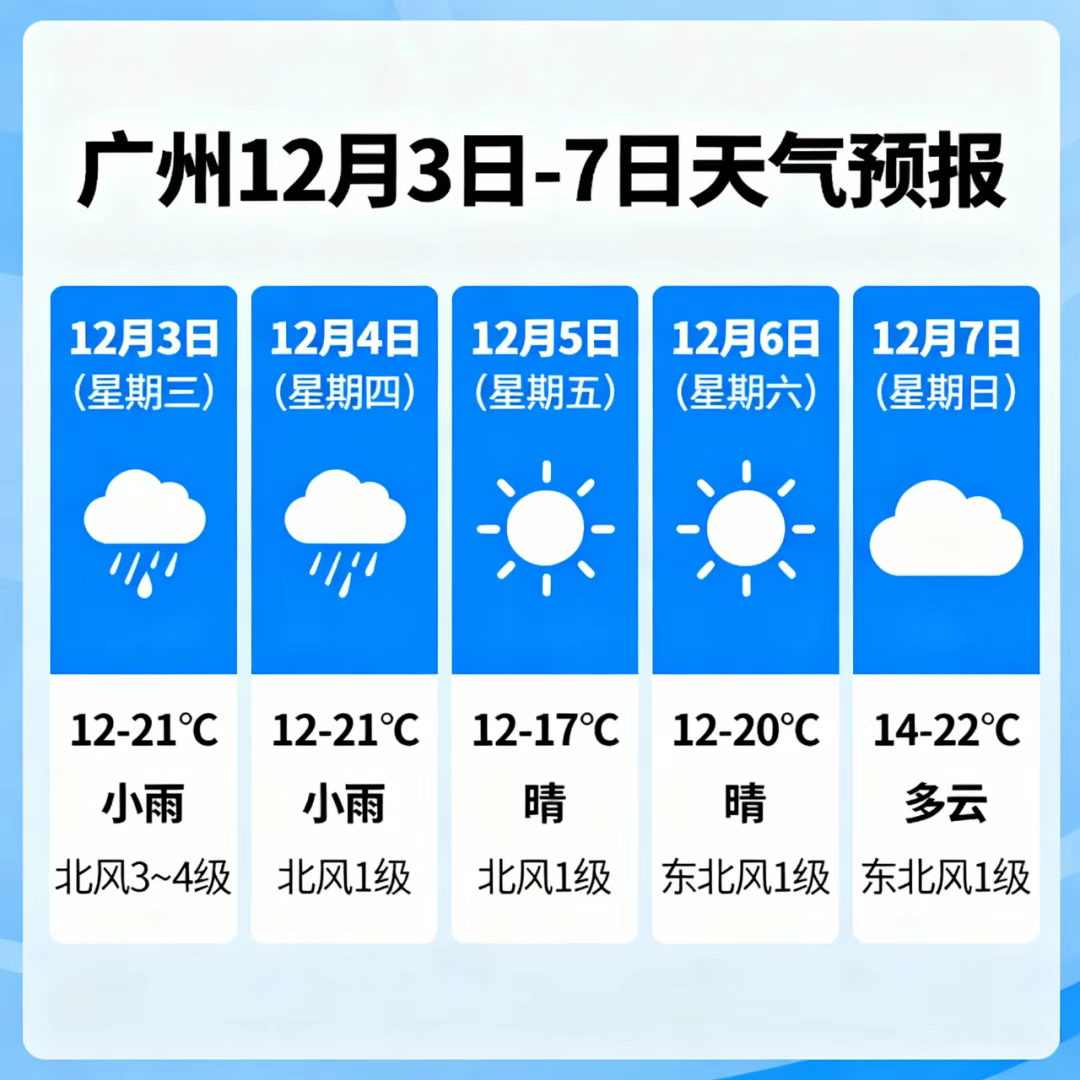 穿衣建议:12月3-7日,广州气温在12-22℃之间。早晚温差较大,天气多变,建议携带长袖T恤、薄毛衣、薄针织衫、防水防风外套、风衣和雨具,采用多层穿搭应对多变天气。美容院美业展
