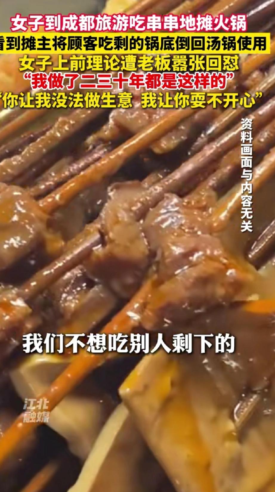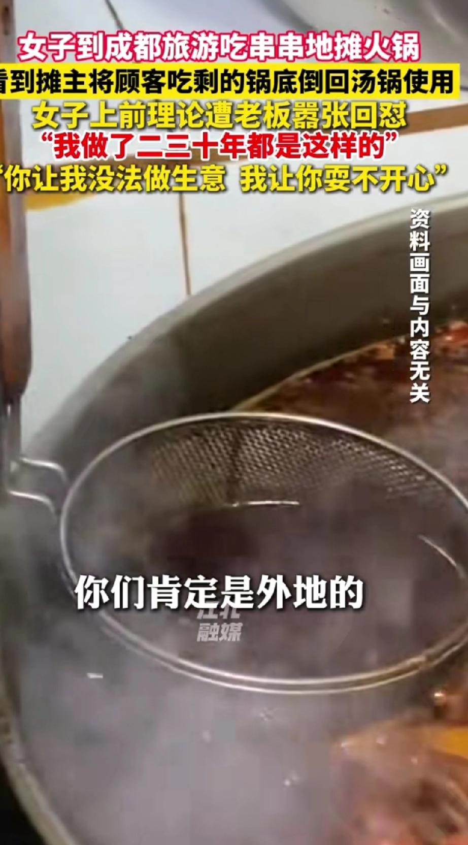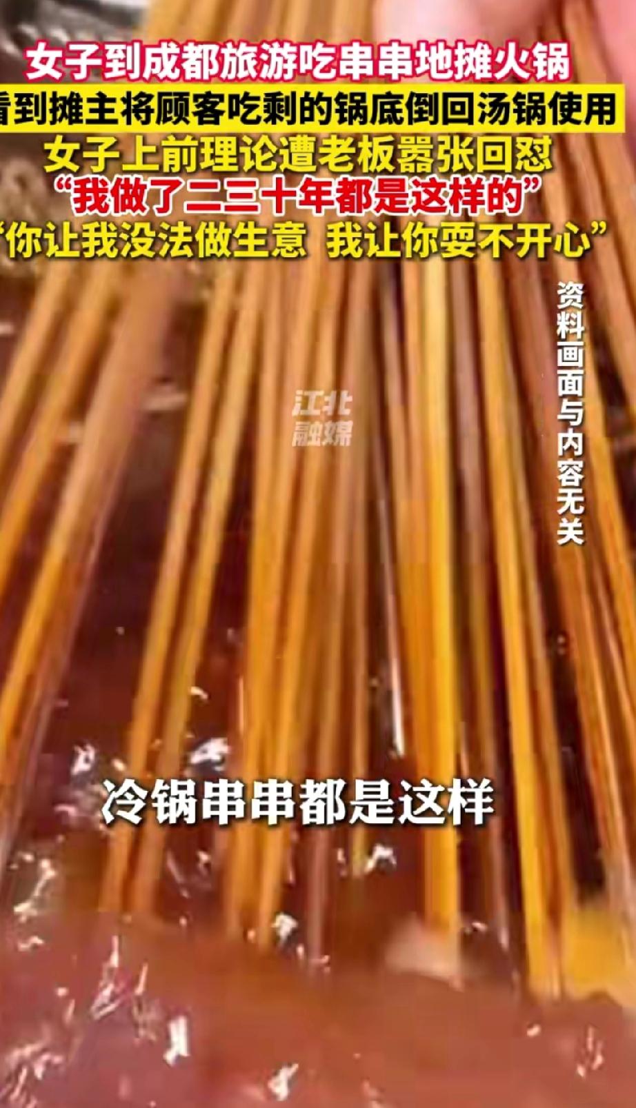 一对情侣前往成都旅游,品尝当地闻名的“冷锅串串”。进食间,他们目睹店主将上一桌客人吃剩的串串和汤汁,重新倒入煮串串的锅中。 小情侣见状十分诧异,胃里一阵翻涌,直犯恶心,当即停下进食,开始留意店主的举动。 没过多久,他们又看到老板把客人剩下的串串再次倒进锅里。 女子已将这一幕拍了下来,便举着手机找老板理论。 她气愤地质问老板:“你把别人吃剩的东西又倒回去,我开始还以为自己看错了,结果你又倒了一次。我们可不想生病,更不想吃别人的口水。” 老板回应道:“我留了电话,你们要是吃死了,明天可以打电话给我,我赔你们。你们肯定是外地人,我做这行二三十年一直都这样。” 老板还提高音量威胁道:“要是今天你们坏我生意,我让你们玩不痛快,我就跟着你们。” 冷锅串串是成都颇具名气的小吃,香辣可口,深受全国各地游客喜爱。 我认为,并非所有摊贩都会把客人剩下的食材重新倒回锅里,这关乎良心。 然而视频中的这位老板,竟大言不惭地称自己一直如此,既违反了《食品安全法》,又丧失了道德底线。 我不禁想问这位老板,你自己会吃你做的冷锅串串吗? 为了不让这种只顾牟利、不顾他人健康的老板逍遥法外,女子已向当地有关部门进行了投诉。 来源:江北融媒