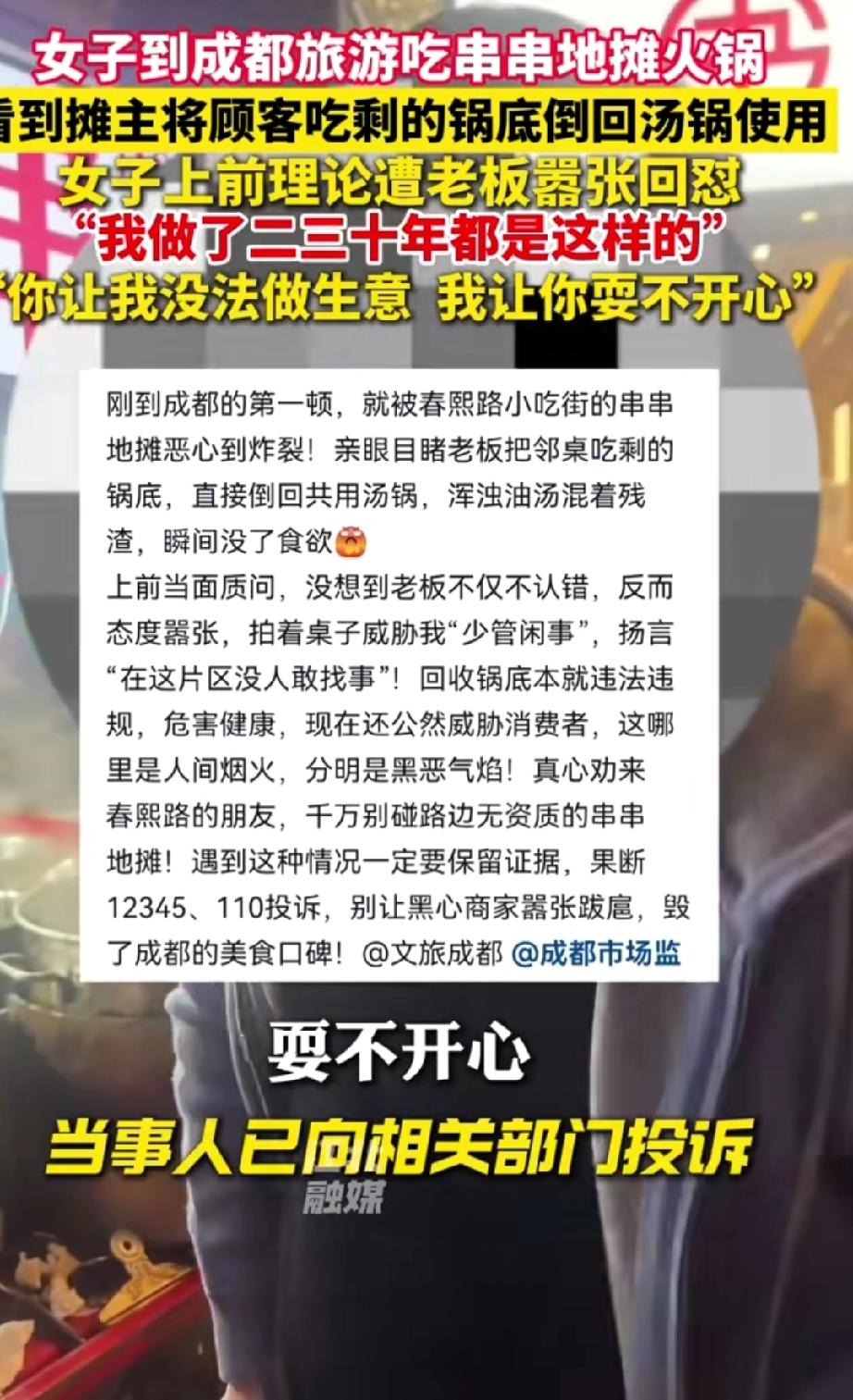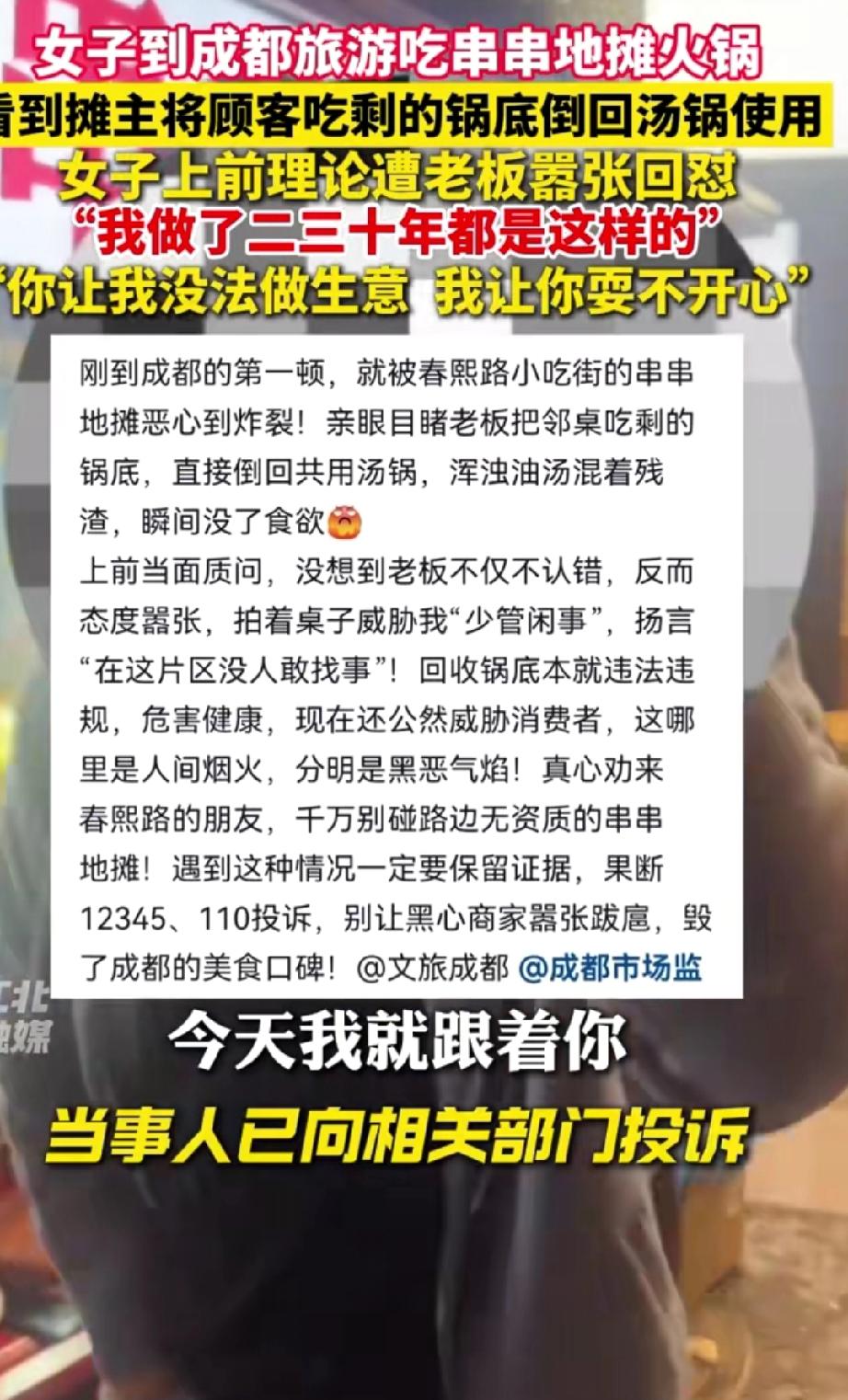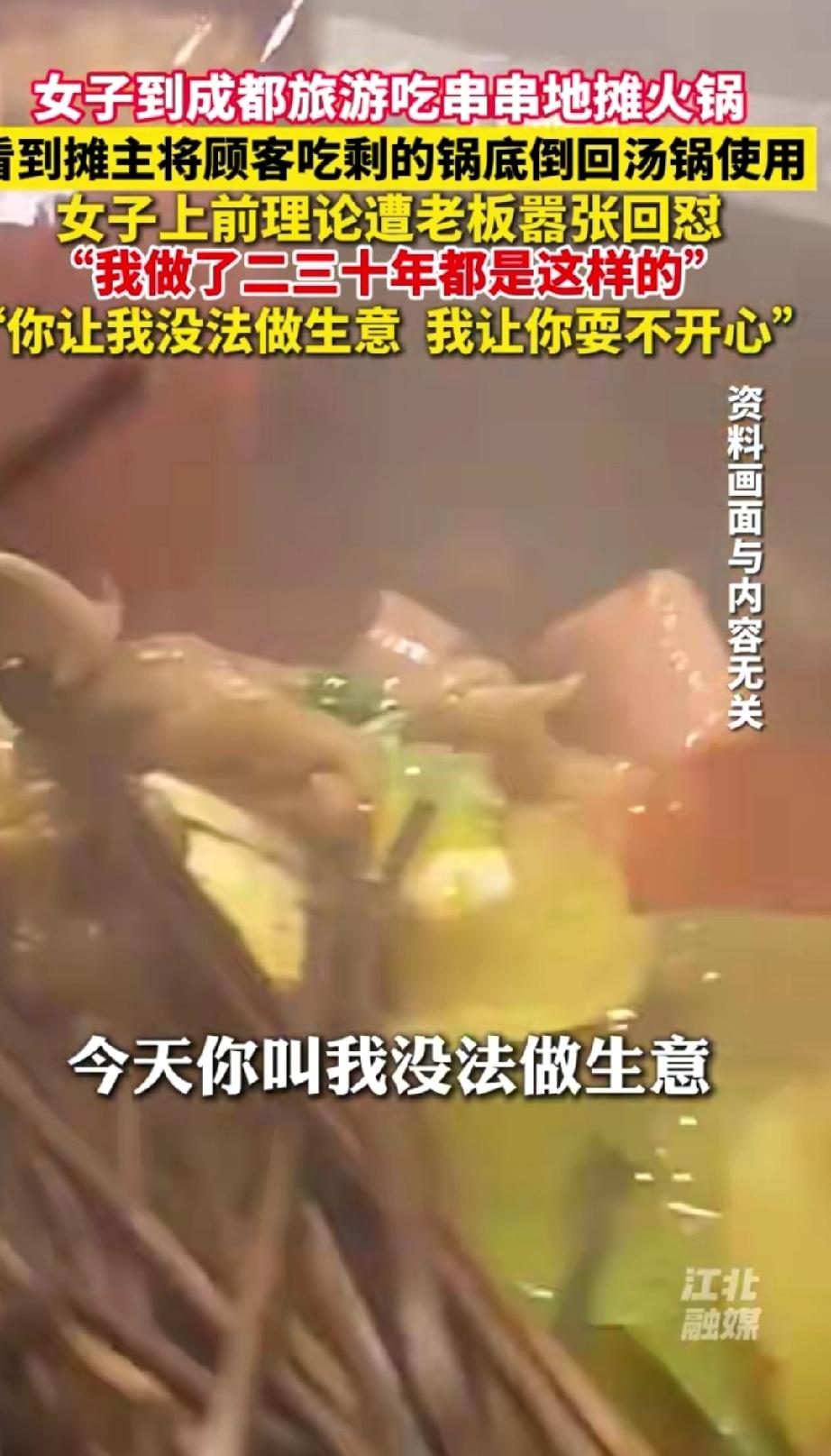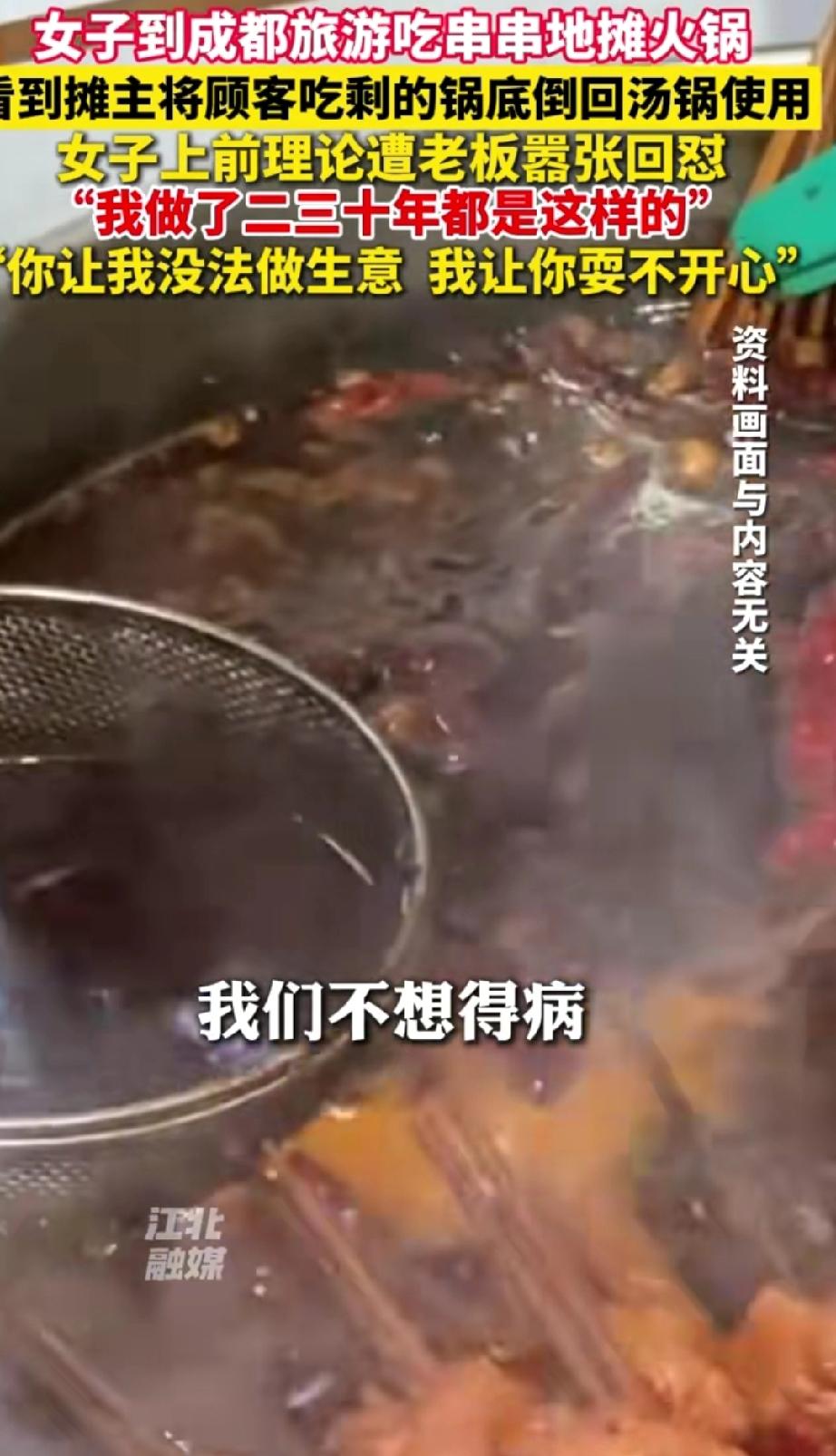 一对情侣前往成都旅游,品尝当地闻名的“冷锅串串”。进食间,他们目睹店主将上一桌客人吃剩的串串和汤汁,重新倒入煮串串的锅中。 小情侣见状十分诧异,胃里一阵翻涌,直犯恶心,当即停下进食,开始留意店主的举动。 没过多久,他们又看到老板把客人剩下的串串再次倒进锅里。 女子已将这一幕拍了下来,便举着手机找老板理论。 她气愤地质问老板:“你把别人吃剩的东西又倒回去,我开始还以为自己看错了,结果你又倒了一次。我们可不想生病,更不想吃别人的口水。” 老板回应道:“我留了电话,你们要是吃死了,明天可以打电话给我,我赔你们。你们肯定是外地人,我做这行二三十年一直都这样。” 老板还提高音量威胁道:“要是今天你们坏我生意,我让你们玩不痛快,我就跟着你们。” 冷锅串串是成都颇具名气的小吃,香辣可口,深受全国各地游客喜爱。 我认为,并非所有摊贩都会把客人剩下的食材重新倒回锅里,这关乎良心。 然而视频中的这位老板,竟大言不惭地称自己一直如此,既违反了《食品安全法》,又丧失了道德底线。 我不禁想问这位老板,你自己会吃你做的冷锅串串吗? 为了不让这种只顾牟利、不顾他人健康的老板逍遥法外,女子已向当地有关部门进行了投诉。 来源:江北融媒