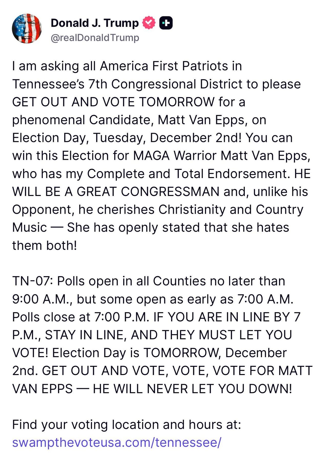 🚨🔥刚刚发布:川普总统的紧急呼吁~ 💥我们绝不能让一个川普+22 (意指在上一次总统选举中,这个选区川普比拜登多赢了 22 个百分点)的选区在明天翻蓝!