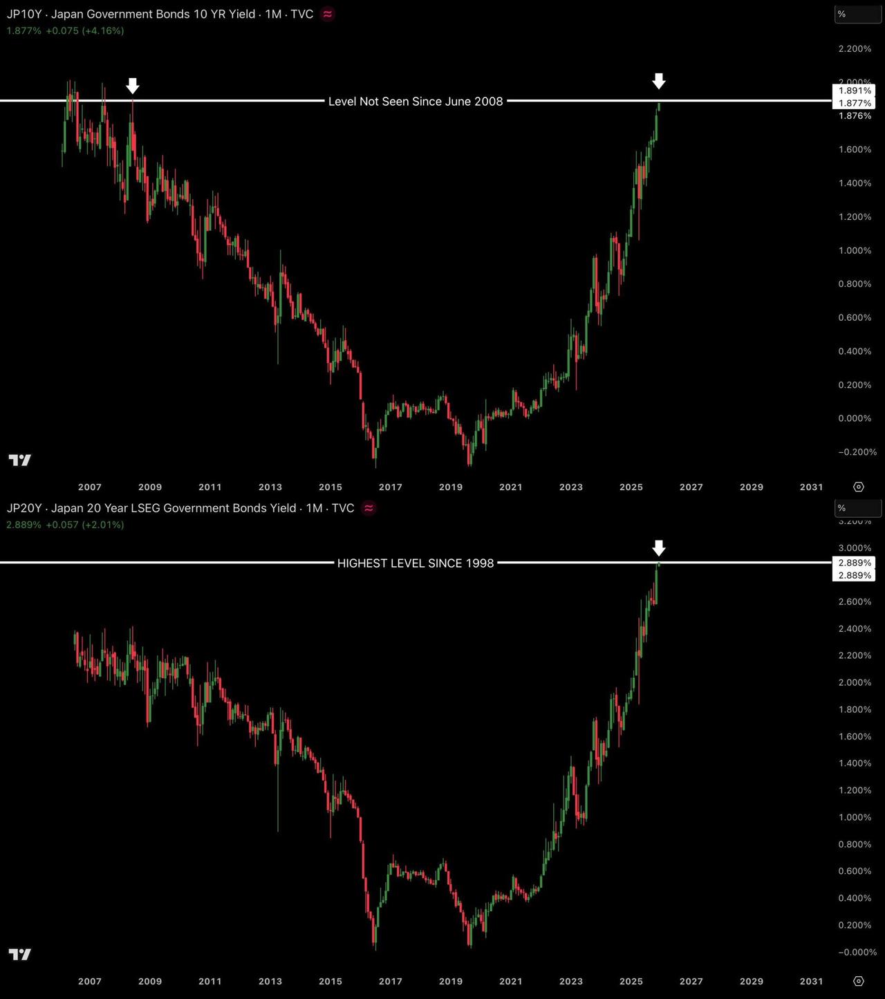 日本债券市场刚刚崩了 🚨 今天,比特币和整个加密市场突然开始暴跌,短短几小时内就有7.85亿美元被清算。同时,白银价格飙升至历史新高,市场一片混乱,所有人都在困惑发生了什么。真正的答案来自日本债券市场,而且比大多数人意识到的更严重。