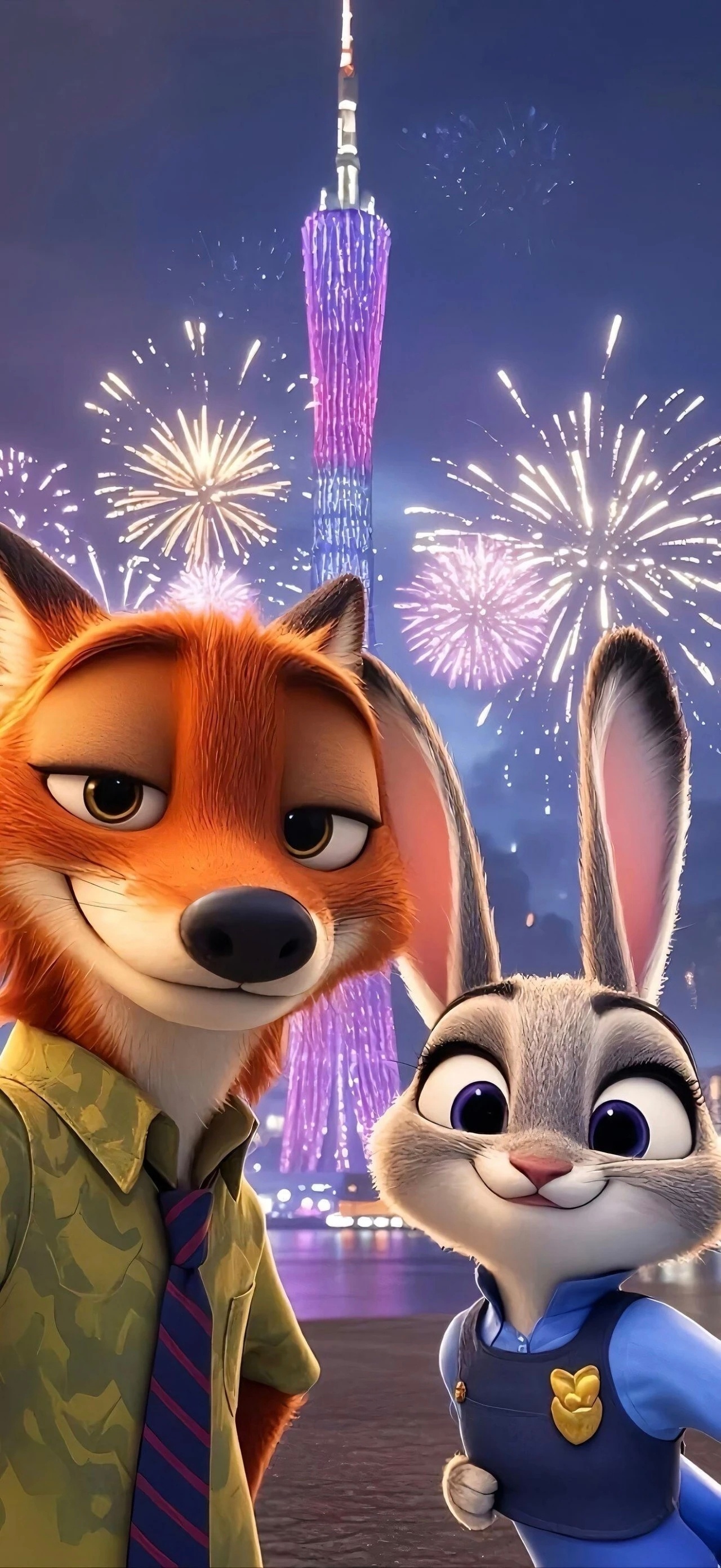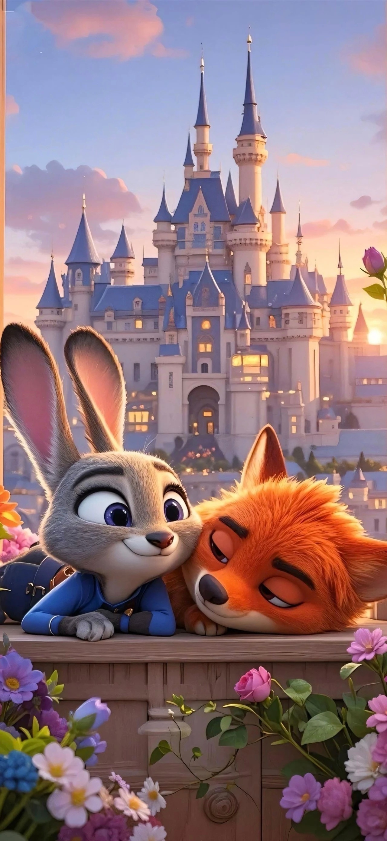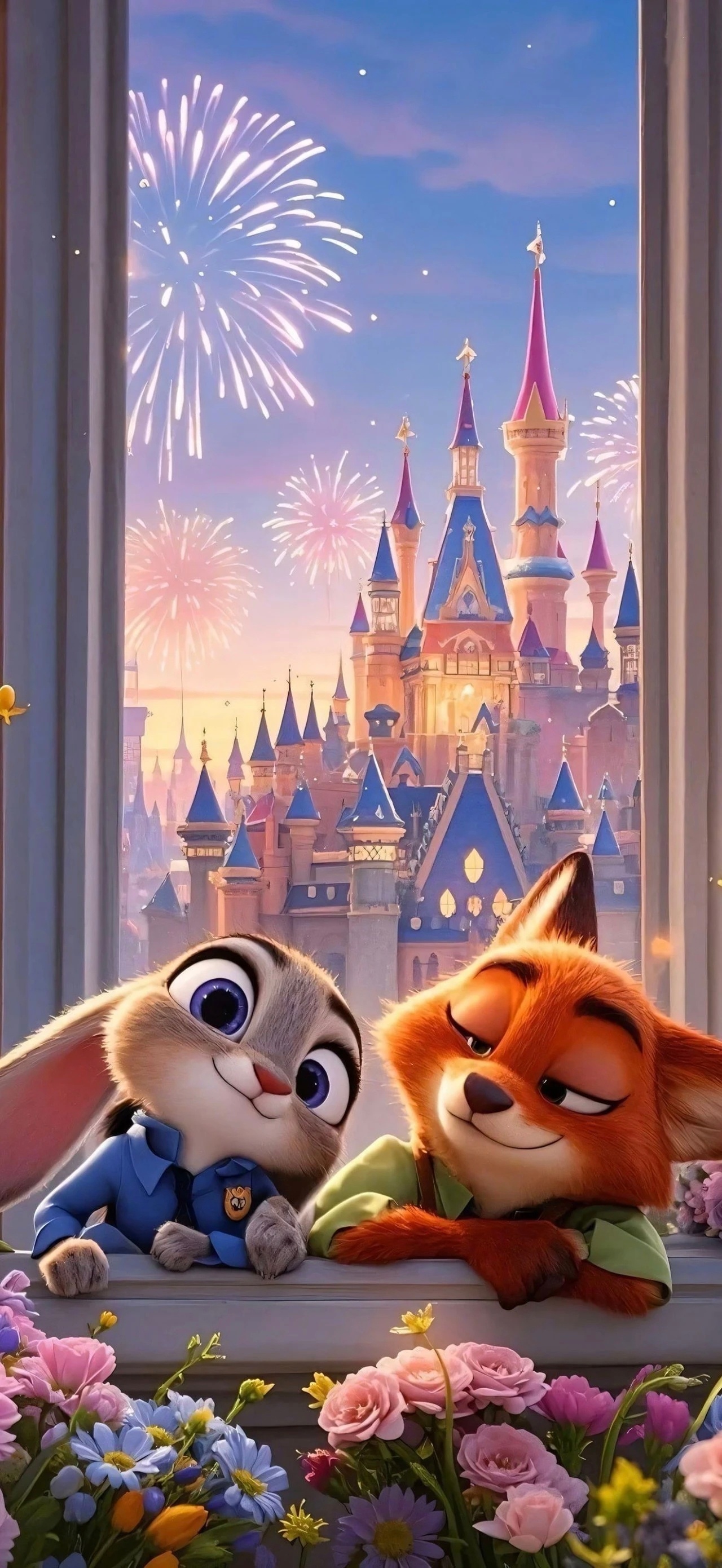 动漫次元新星计划疯狂动物城2 最美的童话城堡要和你一同前往,最灿烂的烟火要和你一同欣赏。尼克和朱迪狐兔cp的手机壁纸。