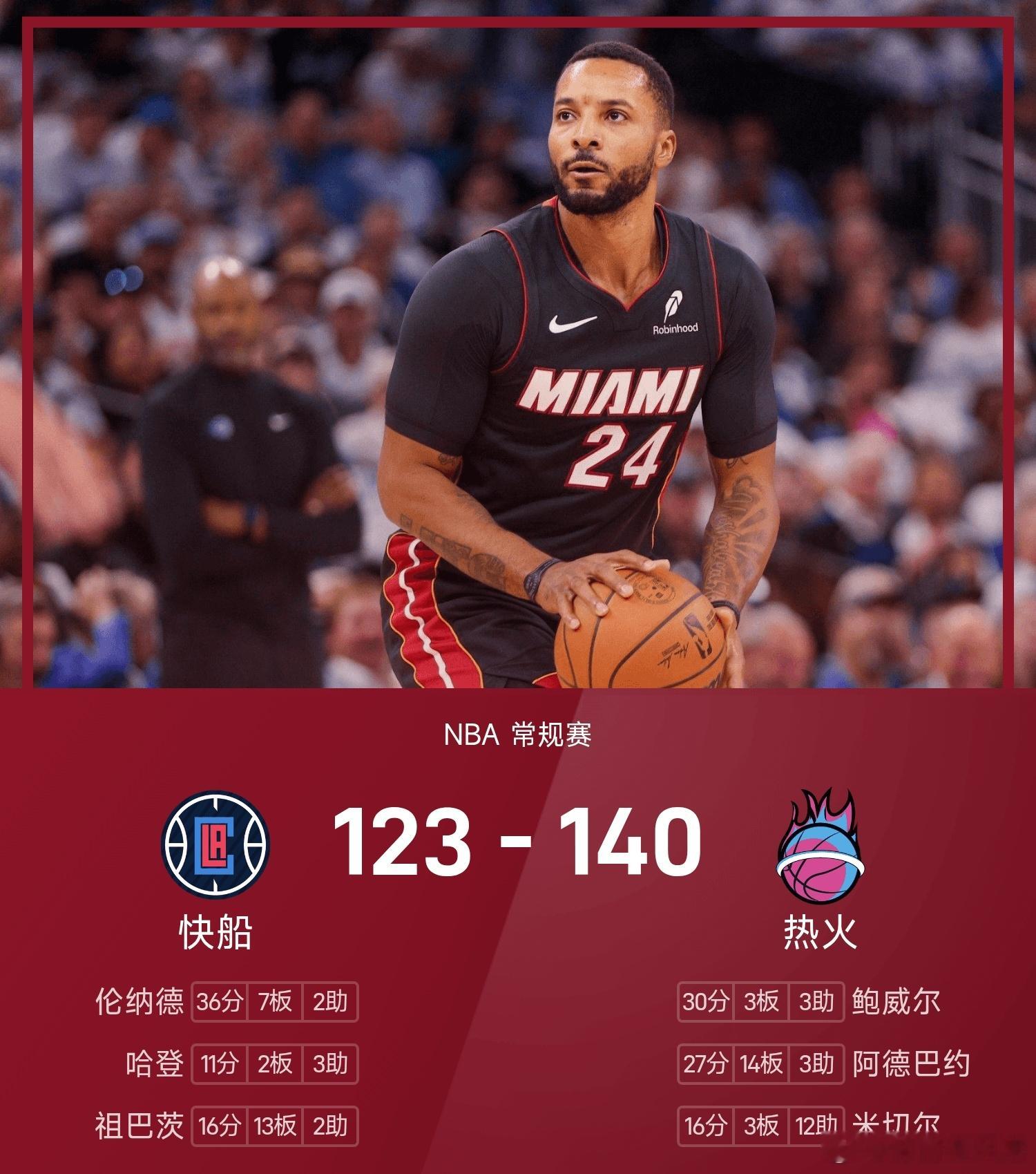 快船vs热火 热火140-123战胜快船。鲍威尔得到30分3板3助率队取胜,伦纳