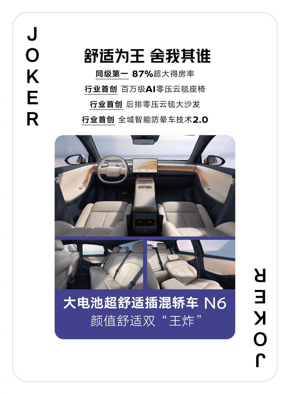 四个2两个王N6叫地主日产最近关于N6的几波营销确实变得非常的接地气,好像新能源产品在产品设计和营销完全搞了两套班子。大沙发发布会把“沙发”这个日产传统优势再放大,谁买车还不是为了图个舒服?而且还加入了 AI 科技,把旧大沙发变成了新大沙发。关于车机智能化,新能源技术方面正面刚中国品牌确实有点难,但做到不掉队就挺好。这个打法挺正确的,路上看到日产 N6也多了起来。新能源汽车
