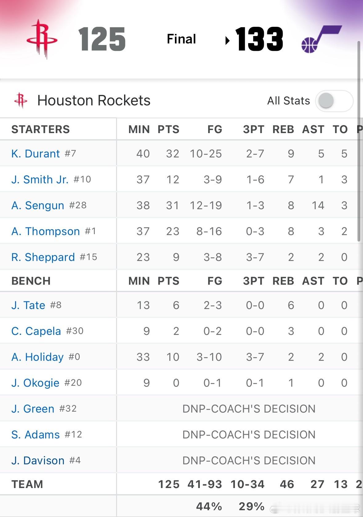 全场比赛结束,火箭客场背靠背二番战爵士最终以125比133不敌爵士,终结了自己的3连胜!杜兰特32分9板5助、申京31分8板14助2断5帽、阿门23分8板3助2帽、史密斯12分7板1助、霍勒迪10分2板2助、谢泼德9分2板2助、泰特6分6板2断、卡佩拉2分3板。火箭vs爵士休斯顿火箭休斯顿火箭