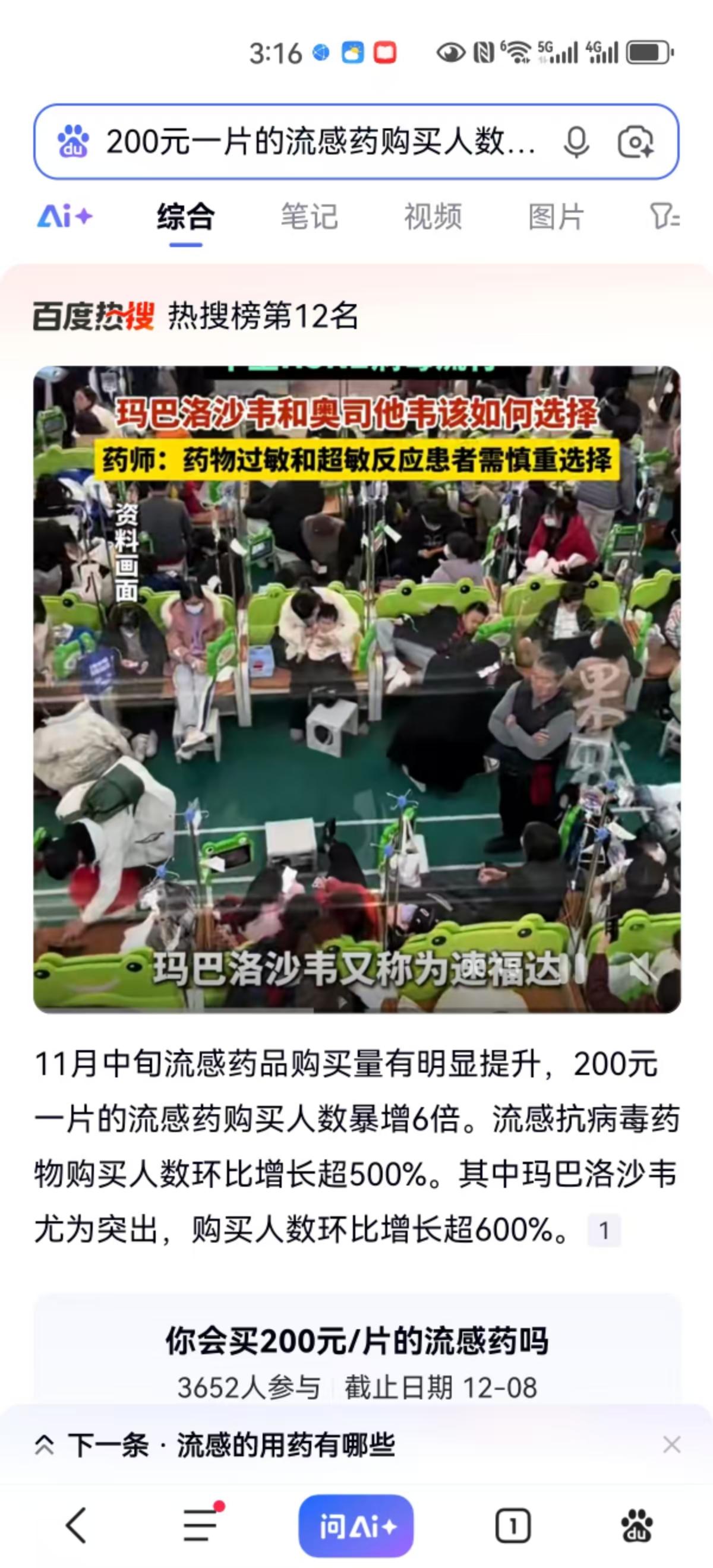 11月中旬,一场突如其来的流感,让药店的柜台变得异常忙碌。一组惊人的数据在悄然流传:流感抗病毒药物的购买人数,环比增长超过500%。而在这场抢购热潮中,一颗名为“玛巴洛沙韦”的药片,以200元的价格和购买人数暴增600%的惊人增幅,成为了风暴的中心。 一颗药,200元,只吃一次。这个价格标签,足以让许多人倒吸一口凉气。网络上,一场关于“值不值”的辩论,瞬间炸开了锅。3652人参与的投票,清晰地分割了两种截然不同的心态。一方认为:“确实贵,但小孩烧到39.8,降不下来,这钱必须花。”另一方则直言:“多少人一天工资不够买一片药的……一些企业摸透了国人的心态,越炒越买。” 这背后,是无数家庭的真实焦虑。一位家长的留言,戳中了许多人的心窝:“我家孩子高烧不退,吃上就好了。”在孩子滚烫的额头和父母焦灼的心面前,200元的价格似乎被赋予了新的意义——它是快速退烧的希望,是免于输液痛苦的捷径。正如另一位网友算的账:“我觉得可以买,比输液3到7天便宜。”这笔经济账,加上时间成本和孩子的痛苦,让许多家长别无选择。 然而,质疑的声音同样响亮。“意思就是必须高价解药才有效呗?”“我都严重怀疑这个流感就是这些厂家炒作出来的。”这些评论,透露出公众对“高价特效药”本能的警惕和不信任。这种不信任并非空穴来风,它源于过去几年里,我们对药品短缺、价格炒作的集体记忆。从新冠期间的囤药潮,到如今的流感药抢购,似乎总有一只无形的手,在拨动公众敏感的神经。 那么,玛巴洛沙韦究竟是什么?它的原研厂家是罗氏制药,其最大的特点就是“全病程只需服用一次”。这颗小小的药片,通过抑制病毒的复制,从根源上对抗流感。专家反复强调,流感不同于普通感冒,它是由病毒引起的急性呼吸道传染病,严重时可能引发肺炎等并发症,因此不能按照平常感冒治疗,及时使用抗病毒药物至关重要。同时,另一款常用药奥司他韦,虽然价格亲民,但部分人服用后会出现剧烈的肠胃反应,这也让一些人转向了副作用相对更小的玛巴洛沙韦。 这场关于一颗药片的争论,其实是我们这个时代消费观念和健康焦虑的缩影。它不再是简单的“买”或“不买”,而是一道复杂的选择题。这道题的选项里,有对科学的信任,有对价格的敏感,有对孩子健康的守护,也有对市场乱象的警惕。 面对流感季,我们需要的不是盲从,也不是一味抗拒,而是理性的判断。首先,要明确诊断,是普通感冒还是流感,最好由医生来判断。其次,要了解药物,知道它的作用、用法和可能的副作用。最后,也是最重要的,是回归常识。勤洗手、多通风、戴口罩、增强自身免疫力,这些最朴素的防护措施,永远是抵御病毒的第一道,也是最坚固的一道防线。 200元一片的药,你买不买?这个问题的答案,在每个人的心里。但比答案更重要的,是我们做出选择前,那份清醒的认知和独立的思考。毕竟,守护健康,既需要科学的武器,也需要理性的头脑。 以上内容仅供参考和借鉴