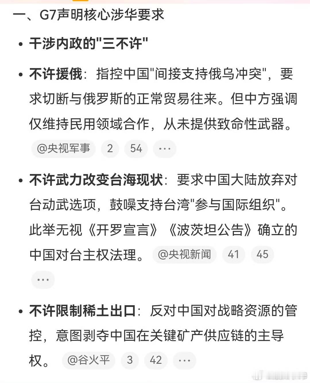 G7凭什么对中国提3个不许凭啥,凭他们又当又立不要脸呗真要援俄的话早平推到东欧平原了,还能搁这和你谈?