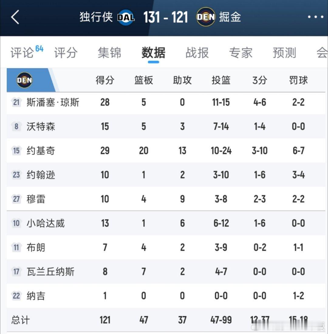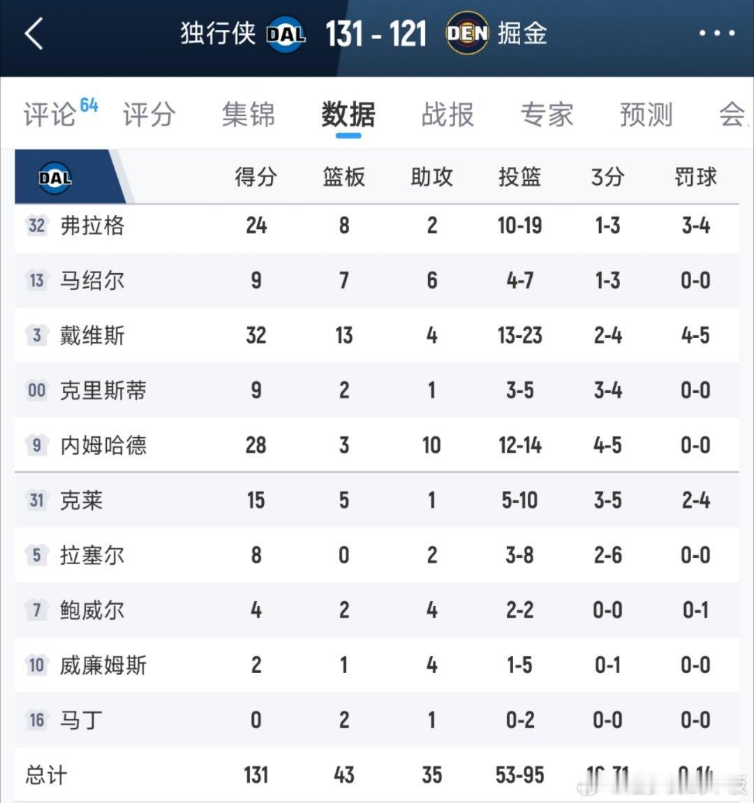 攻克丹佛高原!独行侠客场131-121战胜掘金,取得两连胜!浓眉32分13板4助,小内姆布哈德28分10助,弗拉格24分;约基奇29分20板13助,斯潘塞-琼斯28分独行侠vs掘金