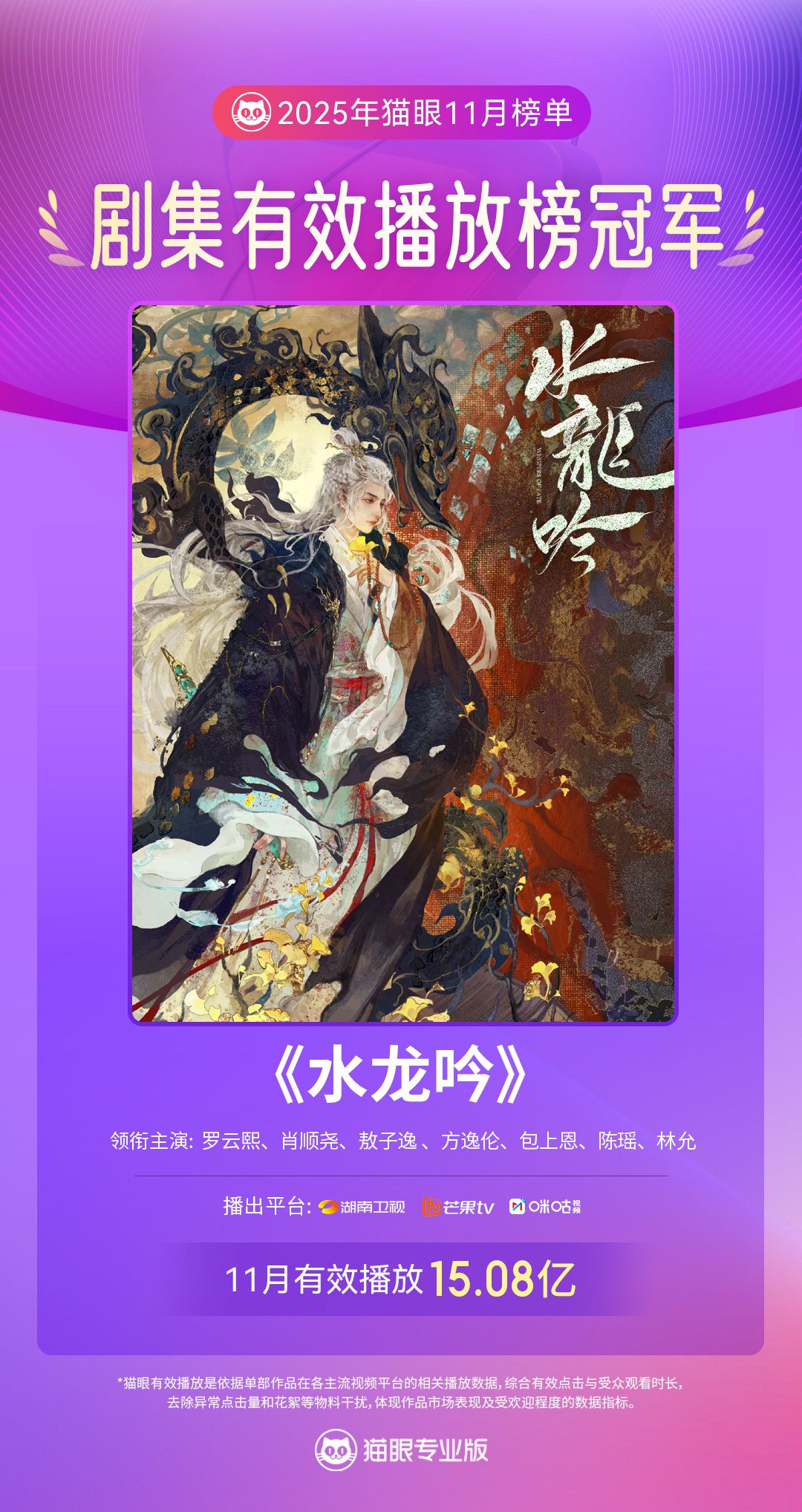 电视剧水龙吟官方水龙吟11月剧集有效播放双榜总冠军 据猫眼专业版数据,(按演员姓氏首字母排名)领衔主演网络剧《水龙吟》11月累计有效播放量15.08亿、集均有效播放量3771.9万,成为2025年11月剧集有效播放双榜总冠军!猫眼11月剧集有效播放榜