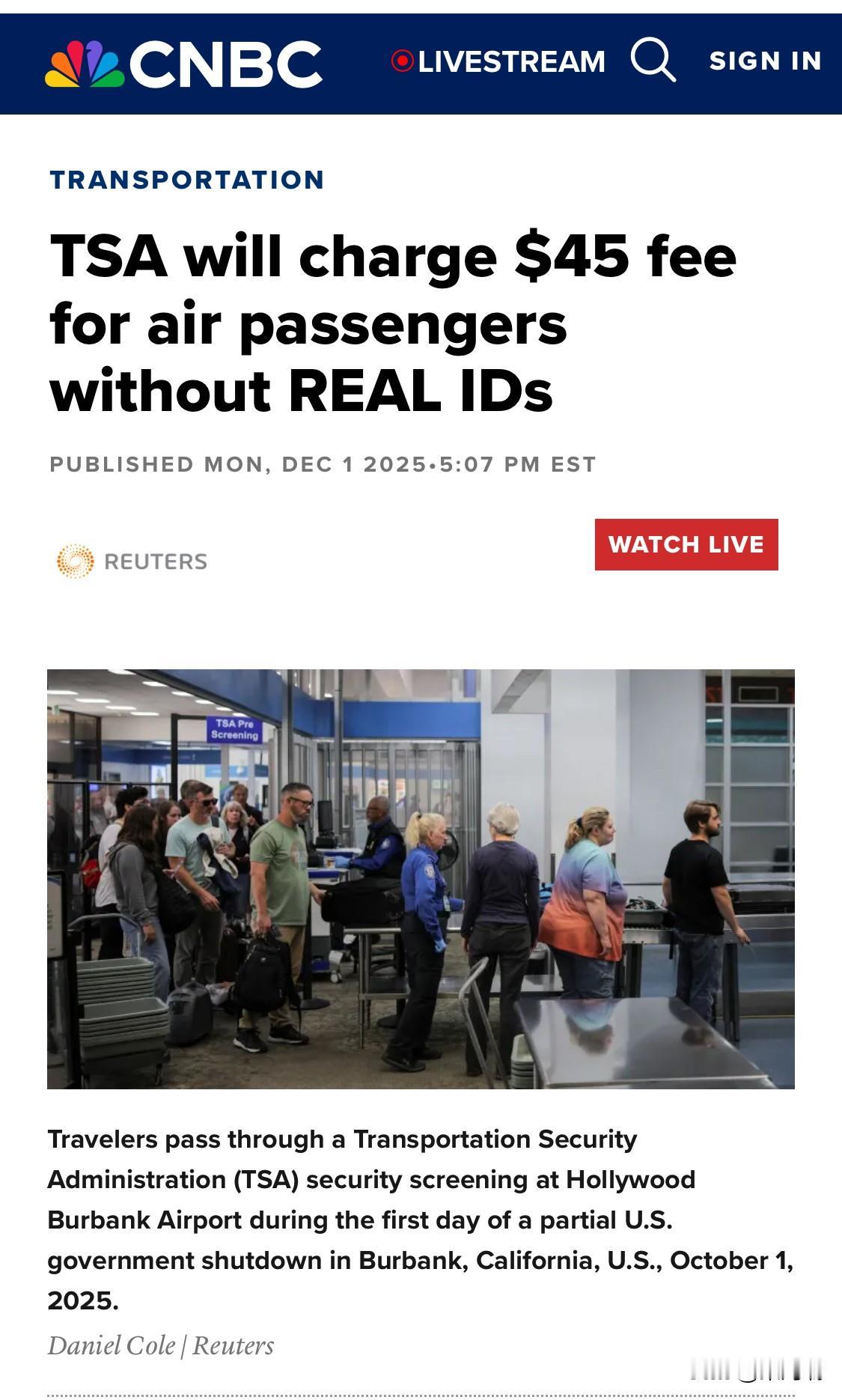 美国运输安全管理局(TSA)宣布,从2026年2月1日开始,在美国机场进行安检时无法出示符合REAL ID标准或其他可接受身份证明(如护照)的旅客将被收取45美元的费用。 这项费用是为了支付使用替代身份验证系统(称为TSA Confirm.ID)的额外操作和技术成本,此举旨在鼓励旅客尽快获取符合联邦安全标准的证件。 关键信息: 生效日期:新费用将于2026年2月1日开始实施。 费用目的:这笔不可退还的费用将用于支付身份核查过程的成本,而不是由纳税人承担。 支付方式:旅客应尽可能在出行前通过 TSA 网站在线支付费用。在机场现场支付可能需要更长时间,并可能导致延误。 有效期:支付一次费用后,通过此流程验证的身份信息有效期为10天。 例外情况:年满18岁以下的儿童在国内旅行时不需要出示身份证明。 替代证件:如果您没有REAL ID,您仍然可以使用其他可接受的身份证明文件,例如有效的美国护照、美国护照卡、永久居民卡或国防部身份证件等。TSA 在其 官方网站上提供了可接受证件的完整列表。 TSA 强烈建议所有旅客尽快办理 REAL ID,或在旅行前准备好其他可接受的身份证明,以避免不必要的延误和费用。REAL ID 法案的全面执行已于2025年5月7日开始。