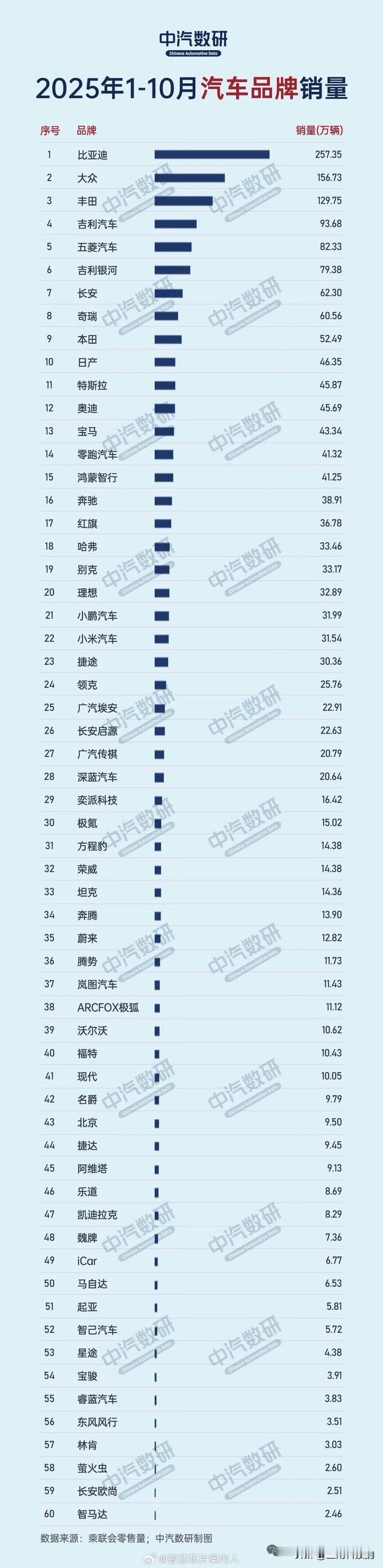 数据来了!2025年1-10月国内市场汽车品牌销量前三名分别为: 比亚迪,257.35万辆; 大众,156.73万辆; 丰田,129.75万辆。 数据来源:乘联会零售量,中汽数研整理 比亚迪确实厉害,两百五十多万辆的数字确实扎眼,差不多是第二名大众和第三名丰田加起来的总和。这个局面放在五年前,估计没几个人敢信。 我记得小时候,家里要是买辆大众或者丰田,那在亲戚朋友眼里算挺有面子的事。桑塔纳、凯美瑞这些车,几乎成了“靠谱”“耐用”的代名词。那时候国产车给人的印象还停留在“价格便宜但小毛病多”的阶段。这才多少年啊,市场格局就彻底翻了个个儿。 以前大家买车,首先问的是“这车是不是合资的”,现在更多人开始琢磨“这车省不省油”“配置高不高”“智能化跟不跟得上”。说白了,老百姓越来越务实了,更看重车子本身能给生活带来什么实在的好处。 这说明现在国产车真的站起来了,不是靠低价,而是实打实的技术和产品被大家认可。身边越来越多朋友买电车首选国产品牌,充电便宜、配置高、科技感强,这些实实在在的好处大家都能感受到。 市场就像大浪淘沙,谁真正抓住老百姓的需求,谁就能留下来。这份销量榜单背后,其实是咱们普通人用真金白银投出的票。 国产车靠新能源实现了弯道超车,合资车暂时靠老本还能稳住,但竞争已经完全不同往日了。不过对咱们消费者来说,竞争越激烈,能挑到的好车就越多,也能倒逼所有品牌拿出更实在的产品,这是好事。大家觉得呢?