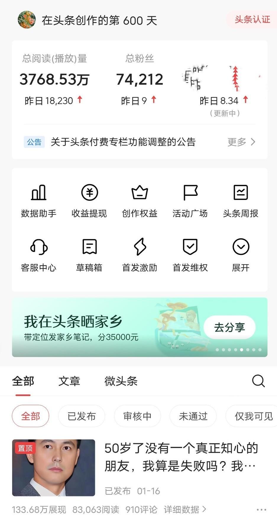 今天是来头条第600天的日子,本来是想好好庆祝一番纪念这个特别的日子,但今天打开收益一看,收票破天荒的降到了个位数,一天比一天低,今天只有8元3角4分,连一碗早餐钱都不够,600天来从来没有断更过,就为了挣点零花钱,期间把眼睛都熬坏了,那想到头条规则不断改变,挣点钱越来越难了,准备熬不下去了,大家有没有其他办法,麻烦告之一声[祈祷][祈祷][祈祷][祈祷]
