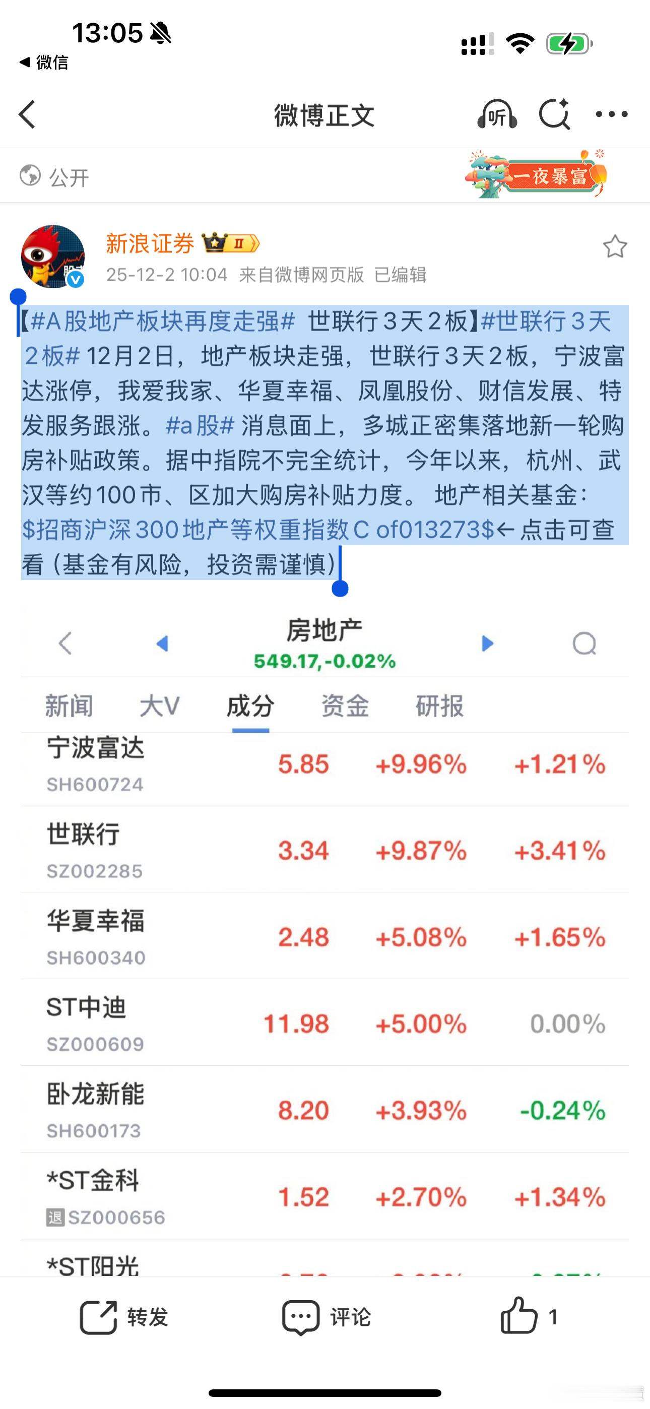 炸了!地产股3天2板狂掀涨停潮,100城撒钱救市!A股地产板块今天又杀疯了!世联行上演3天2板的彪悍行情,宁波富达直接封死涨停,我爱我家、华夏幸福等一大波个股跟涨冲关,盘面热度拉满!背后真相藏不住了——多城正砸钱救市!中指院数据显示,今年杭州、武汉等近100个市、区加码购房补贴,真金白银刺激市场。手里有地产股的朋友,现在是该落袋为安还是继续持有?没上车的要不要趁机布局?评论区说说你的操作计划,点赞最高的评论我会单独分析一只潜力股!(基金有风险,投资需谨慎)【A股地产板块再度走强 世联行3天2板】世联行3天2板 12月2日,地产板块走强,世联行3天2板,宁波富达涨停,我爱我家、华夏幸福、凤凰股份、财信发展、特发服务跟涨。a股 消息面上,多城正密集落地新一轮购房补贴政策。据中指院不完全统计,今年以来,杭州、武汉等约100市、区加大购房补贴力度。 地产相关基金:$招商沪深300地产等权重指数C of013273$←点击可查看(基金有风险,投资需谨慎)