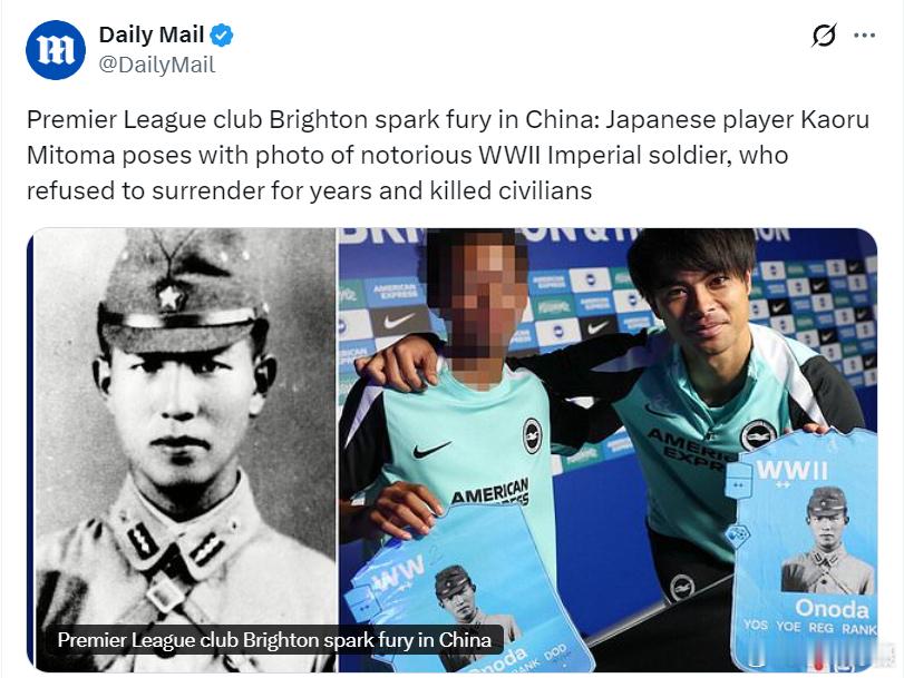 日本国脚竟持战犯照片合影 外媒都动起来了哟!《每日邮报》报道,英超俱乐部布莱顿在中国引发愤怒:日本球员三笘薰与臭名昭著的二战帝国士兵照片合影。这名士兵多年来拒绝投降并杀害平民。黄媒不会说的真相