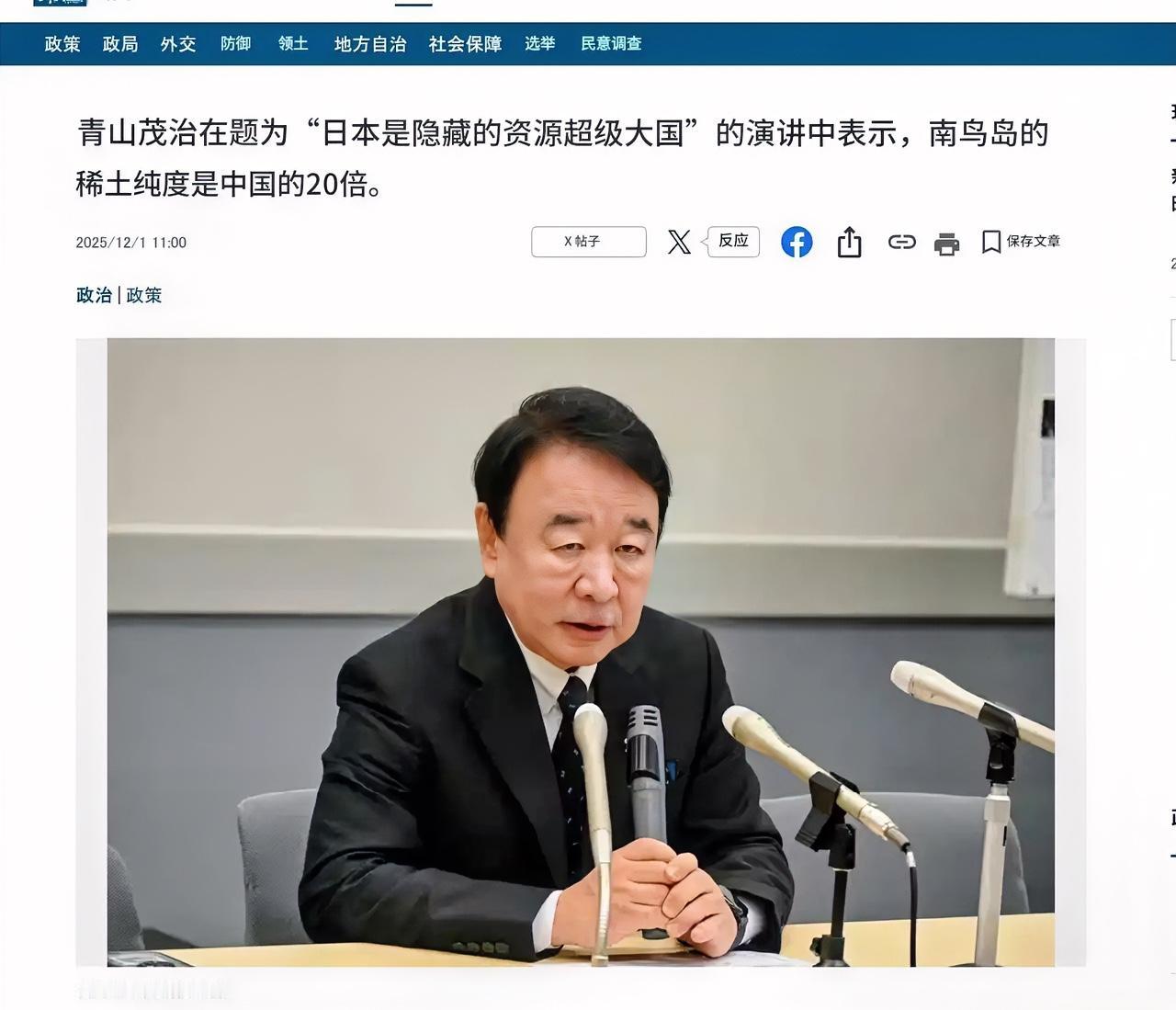 日本自民党的参议员又开始瞎说了。 2025年12月1日,有议员说日本是藏着掖着的资源超级大国,还宣称南鸟岛附近海域的稀土泥浆纯度是中国陆上稀土的20倍。 可别太早得意,且不说按照《开罗宣言》和《波茨坦公告》,日本对南鸟岛有没有开采权都存疑。就算能开采,稀土泥纯度高对精炼到6N以上也没啥大用。 中国在稀土产业链那可是稳稳占据主导地位,储量占37%,精炼产能占92%,重稀土提炼占比更是高达99%。日本早在2010年就想着摆脱对中国稀土的依赖,现在拿南鸟岛的稀土来说事儿,纯粹是自己骗自己罢了。