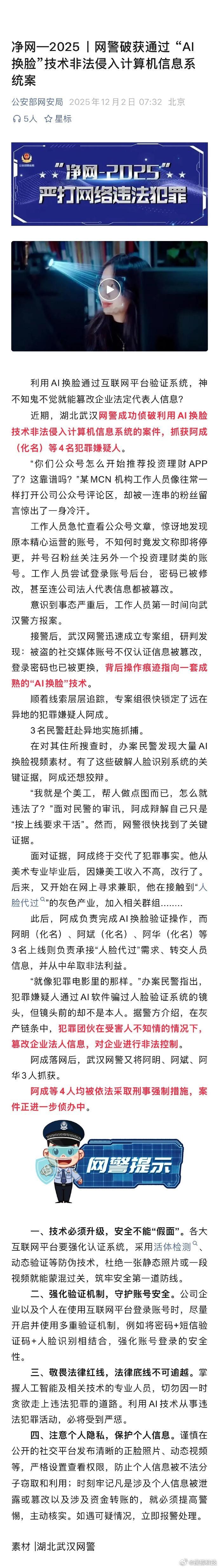 【网警侦破AI换脸侵入计算机案】人脸识别系统虽然给居民带来极大的便利,可一旦信息