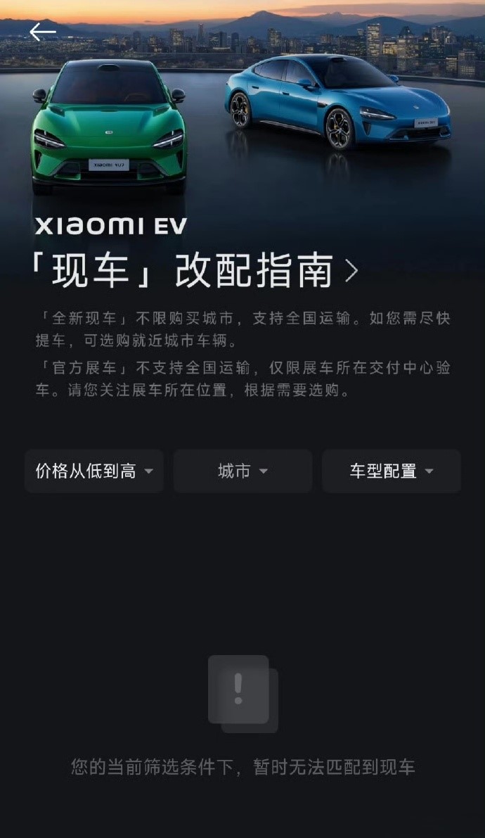 小米现车 一边月交付过4万台,一边帮经销商售卖二手车,运损车以及小米的退订车。从这里就能够看得出小米意图已经很明显,就是告诉经销商小米有强大的线上能力,官方渠道完全能够把车辆卖掉。还有就是小米马上就是上新车了,经销商可以大胆进货。 对于消费者来说,如果等不及可以选择这些车,毕竟有官方新车质保,还能省不少购置税。如果你还等得及,建议还是再等等新车型,或者说换新版本,到时候雷总一定会开放改配权限的,新型技术都给安排上!