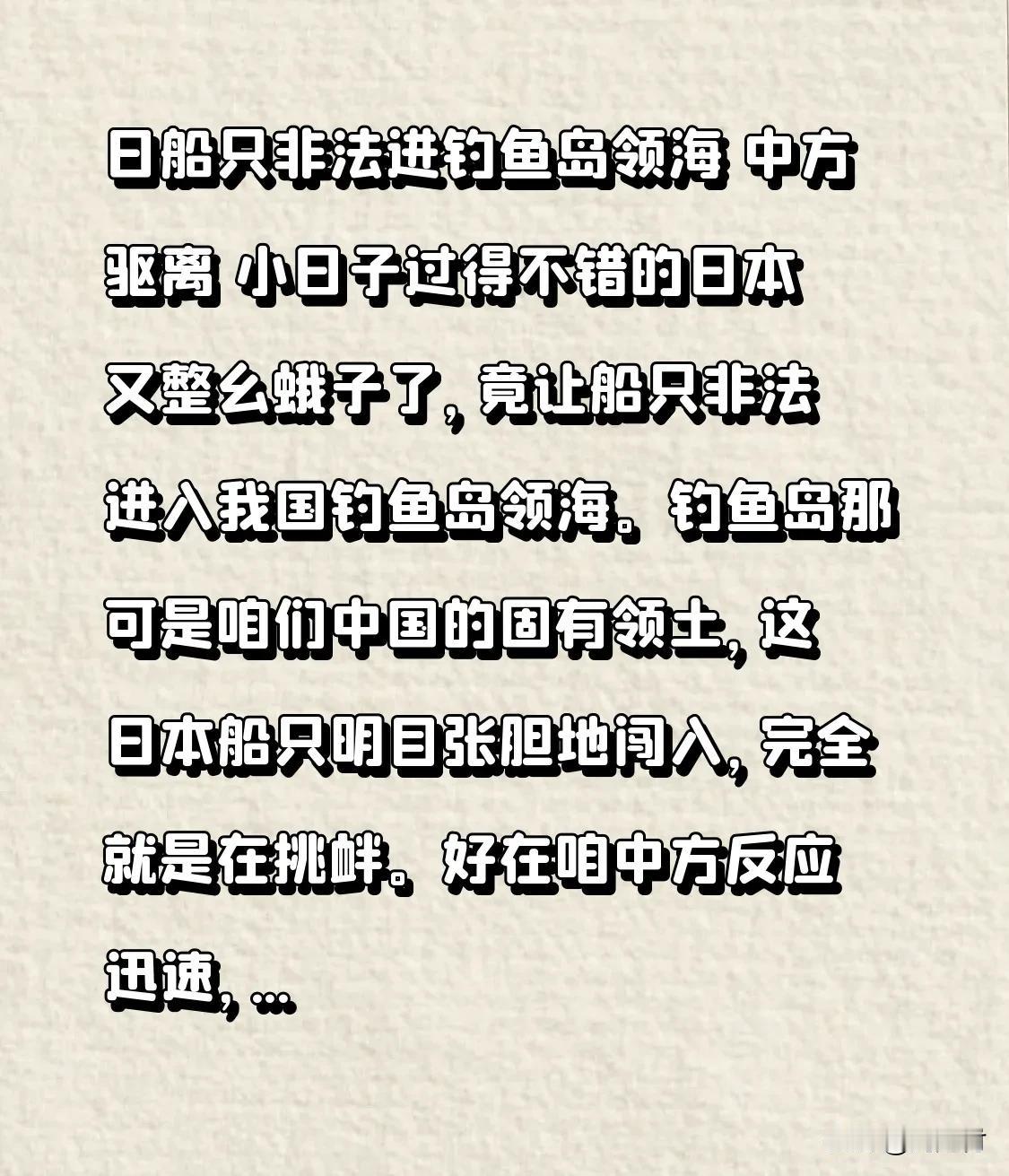 日船只非法进钓鱼岛领海 中方驱离 日船只非法进钓鱼岛领海 中方驱离 日船只非法入钓鱼岛领海 中方果断驱离 “小日子不错”的日本又生事端 派船只非法闯入我国钓鱼岛领海 钓鱼岛乃中国固有领土 日船公然闯入 纯属挑衅行为 好在中方反应敏捷 果断实施驱离 彰显维护领土主权的坚定决心 守护家园 不容侵犯 日本小动作不断 实在令人不齿 我们需时刻警惕 让其明白 中国领土主权神圣不可侵犯 任何染指之举都不会得逞! 去钓鱼岛旅游路线怎么走