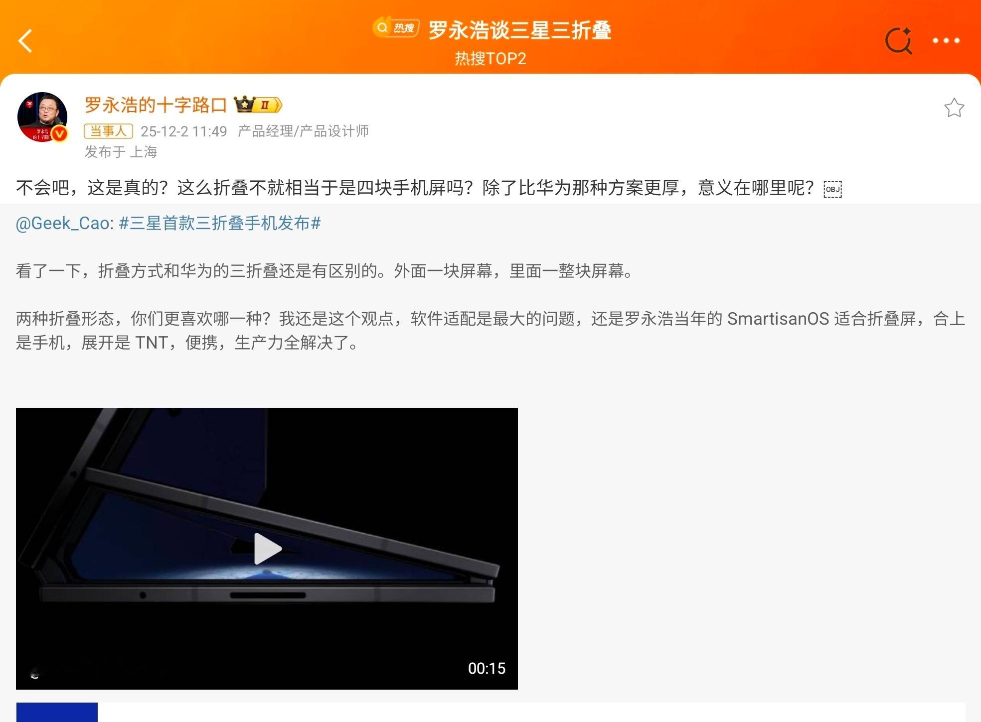 罗永浩谈三星三折叠 这厚很多嘛?