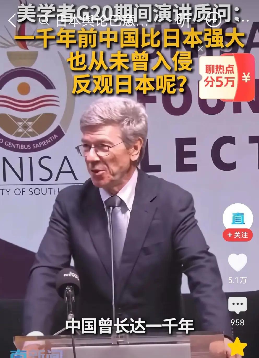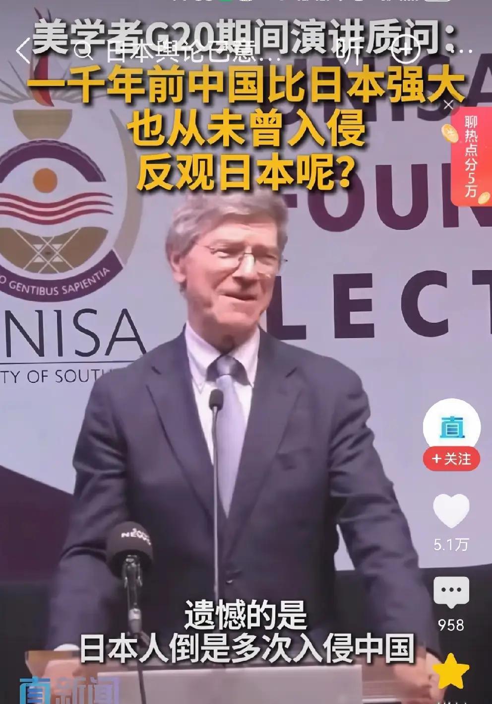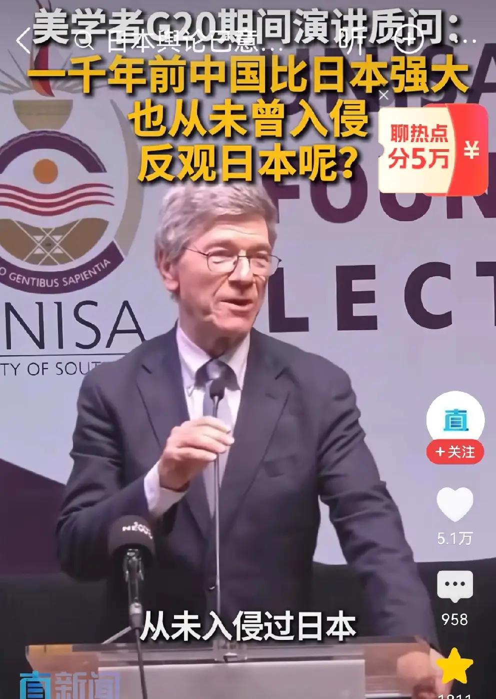 美国学者对日本发出灵魂质问! 美国教授杰弗里,萨克斯,在G20峰会上的演讲,向日本发出灵魂质问: 中国实际上几个世纪,曾长达一千年,从未入侵日本。 尽管是近邻,且当时中国比它强大得多; 遗憾的是,日本人倒是多次入侵中国 ,却从来没有相反的情况! 公道自在人心! 感谢美国教授的正义之声![祈祷][祈祷]
