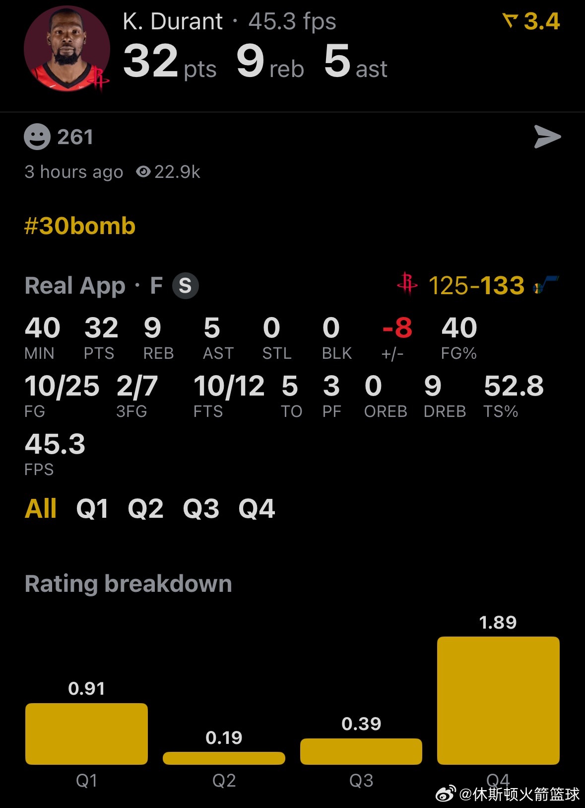 火箭当家球星凯文·杜兰特今天手感冰冷,总体状态一般。但末节时刻,他进攻端急速回暖,里突外投,侵略性拉满,6中4砍下16分带领球队疯狂追分。最后时刻,他化身辅助角色,为队友拉开空间,最终难阻败局,苦吞失利!杜兰特今天出战40分20秒,25中10,其中三分7中2,罚球12中10,得到32分9板5助5失误,正负值-8。火箭vs爵士休斯顿火箭休斯顿火箭