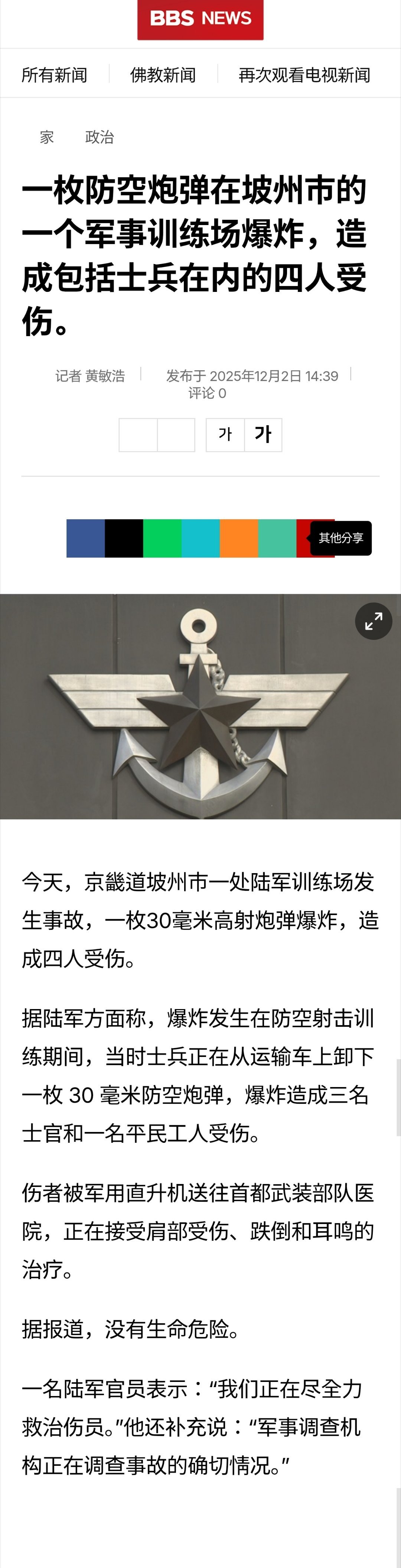 韩国一陆军训练场发生爆炸韩国京畿道坡州市一处陆军训练场当天发生爆炸事故,造成4人