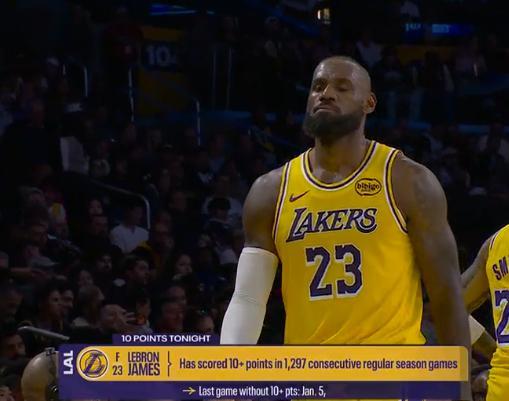 ▲连续1297场得10+分▲上一次得分个位数追溯到2007年1月5日,客场对阵雄鹿拿了8分