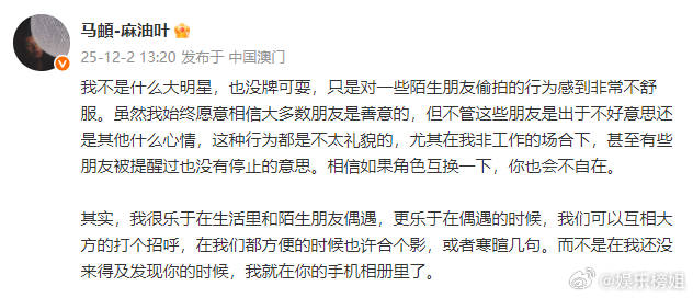 马頔对偷拍感到非常不舒服马頔回应被偶遇:我不是什么大明星,也没牌可耍,只是对一些陌生朋友偷拍的行为感到非常不舒服。