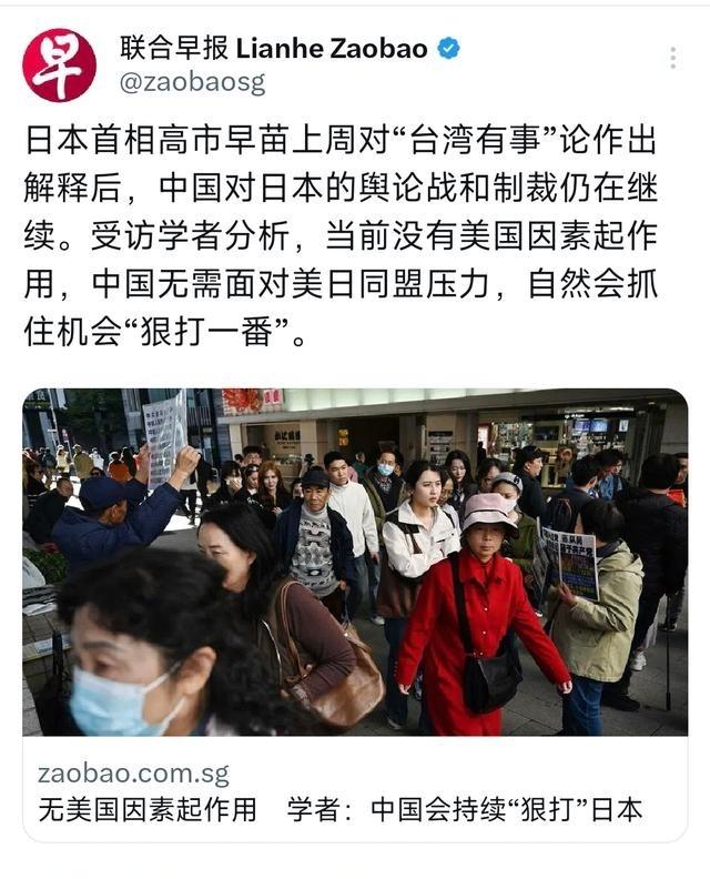 新加坡联合早报12月1日写道:“日本首相高市早苗上周对‘台湾有事’论作出解释后,中国对日本的舆论战和制裁仍在继续。受访学者分析,当前没有美国因素起作用,中国无需面对美日同盟压力,自然会抓住机会‘狠打一番’。” 这事儿说白了,就是高市早苗上台没多久,就在国会里放话,说台湾地区出点事儿,可能就直接威胁到日本的生存,得启动集体自卫权啥的。这话一出口,北京那边立马炸锅了。从11月7日她那番表述开始,中日关系就直线下滑,外交抗议、经济限制、舆论轰炸,一套组合拳下来,日本企业叫苦不迭,旅游业也跟着遭殃。 高市早苗的原话是啥?她在众议院预算委员会上,被立宪民主党议员冈田克也问到台湾地区紧急情况时,直言如果涉及武力使用,比如海上封锁啥的,就可能算作日本的“存亡危机事态”。这可不是随便聊聊,日本的安保法里,这概念一触发,自卫队就能动起来,集体自卫权启动,等于变相说要插手台海事儿。历史上,日本首相从没这么明着表态过,安倍当年也只是卸任后私下提“台湾有事就是日本有事”。高市这回是现任头头,公开国会说出口,等于给美日同盟加码,也给日本右翼壮胆。北京一看,这不光是干涉内政,还挑战战后秩序,开罗宣言、波茨坦公告里台湾主权归中国的事儿,日本当年签字认了,现在又翻旧账,气不打一处来。 中方反应快而狠。外交部发言人毛宁连着几天点名批评,先是召见日本驻华大使金杉宪治,副部长孙卫东列出五条严重后果,强调台湾是中国领土,外部势力别插手。接着,教育部发留学警示,建议中国人慎去日本念书;文化旅游部跟进,旅游警示升级,航班调整,热门线路如东京大阪的团游大批取消。日本水产品进口又卡壳了,北海道扇贝刚恢复没几天,就被叫停。官媒人民日报双语海报一连串,标题像“三问高市”,直戳她违背中日联合声明、历史承诺。联合国那边,中国常驻代表傅聪写信给秘书长古特雷斯,重申2758号决议,一个中国原则不容动摇。 俄罗斯外交部扎哈罗娃三次谴责,说日本不反省二战罪责,俄军还去北部海域演习示威。越南越中友协阮明环签声明,批高市违背开罗宣言。塞尔维亚学者拉杰瓦茨说这是粗暴干涉,担心日本重蹈覆辙破坏亚太稳定。长远看,这波摩擦暴露中日互信脆,中方要高市道歉撤回,日本要稳经济,骑虎难下。话说回来,高市这步棋,走得太急,等于给盟友当出头鸟,美国乐见其成却不扛雷,日本老百姓买单。地区稳定,本来就靠大家克制,现在这架势,东亚水又浑了。希望双方早点降温,别让小摩擦变大祸。