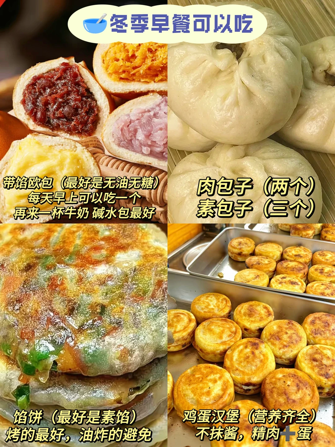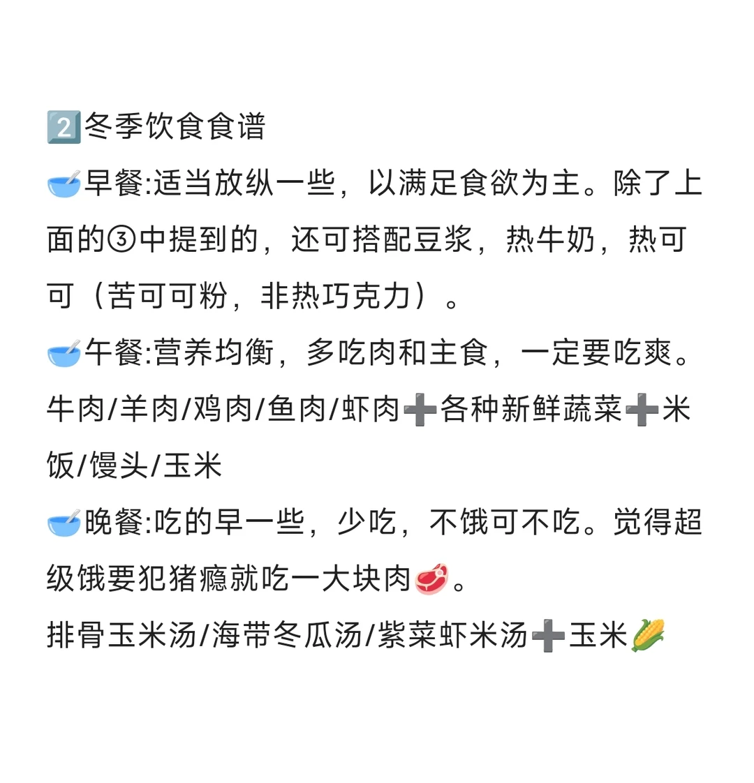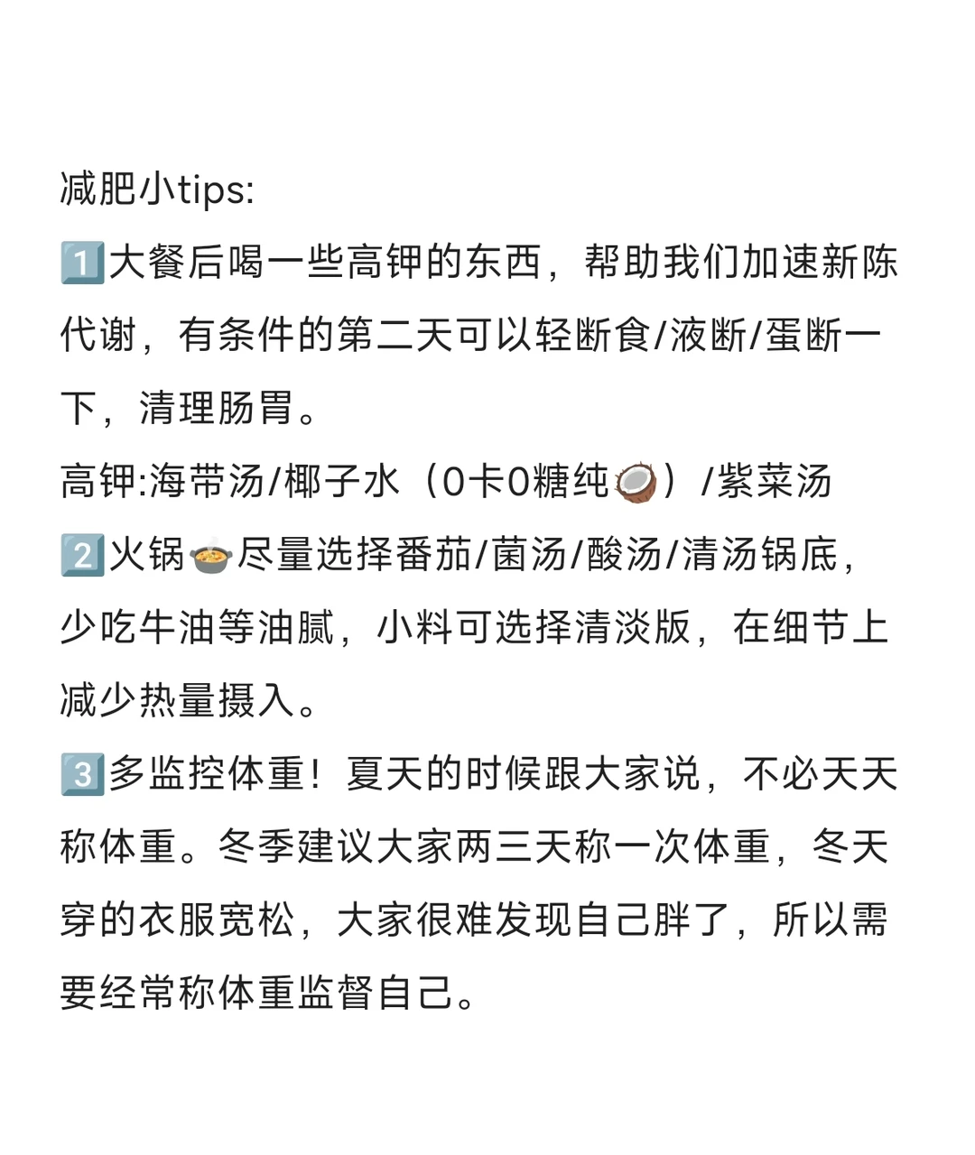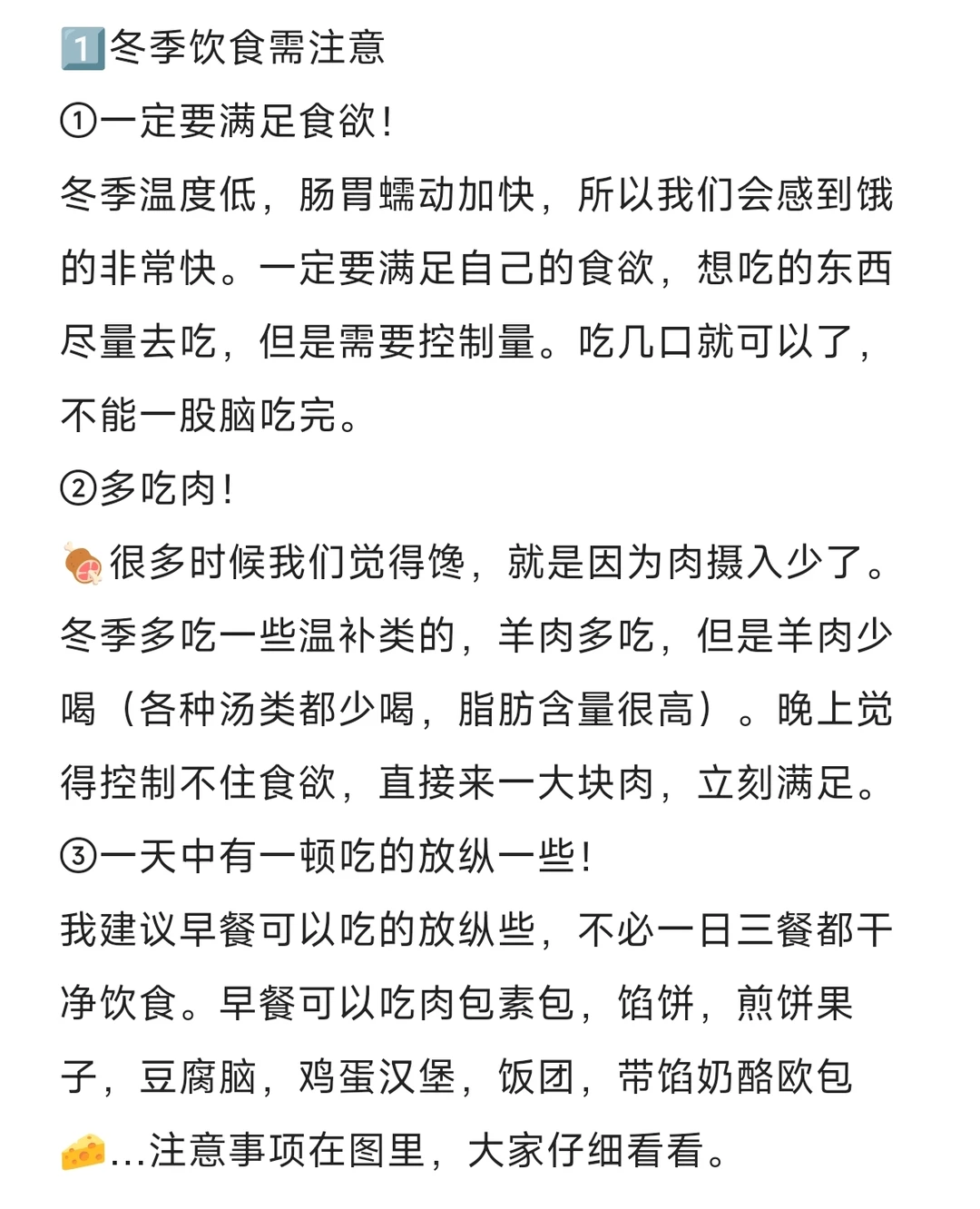 最近好多姐妹跟我反馈自己长胖了,一到这个时间就控制不住自己的食欲,夏天剪的全吃回去了,问我冬天怎么控制体重。我是建议大家冬季不要过分苛责自己的身体,保持不涨秤就可以。同时也给大家整理了一些冬天减肥邪修的小窍门😎。希望可以帮到美女们🥰~ 1️⃣冬季饮食需注意 ①一定要满足食欲! 冬季温度低,肠胃蠕动加快,所以我们会感到饿的非常快。一定要满足自己的食欲,想吃的东西尽量去吃,但是需要控制量。吃几口就可以了,不能一股脑吃完。 ②多吃肉! 🍖很多时候我们觉得馋,就是因为肉摄入少了。冬季多吃一些温补类的,羊肉多吃,但是羊肉少喝(各种汤类都少喝,脂肪含量很高)。晚上觉得控制不住食欲,直接来一大块肉,立刻满足。 ③一天中有一顿吃的放纵一些! 我建议早餐可以吃的放纵些,不必一日三餐都干净饮食。早餐可以吃肉包素包,馅饼,煎饼果子,豆腐脑,鸡蛋汉堡,饭团,带馅奶酪欧包🧀…注意事项在图里,大家仔细看看。 2️⃣冬季饮食食谱 🥣早餐:适当放纵一些,以满足食欲为主。除了上面的③中提到的,还可搭配豆浆,热牛奶,热可可(苦可可粉,非热巧克力)。 🥣午餐:营养均衡,多吃肉和主食,一定要吃爽。 牛肉/羊肉/鸡肉/鱼肉/虾肉➕各种新鲜蔬菜➕米饭/馒头/玉米 🥣晚餐:吃的早一些,少吃,不饿可不吃。觉得超级饿要犯猪瘾就吃一大块肉🥩。 排骨玉米汤/海带冬瓜汤/紫菜虾米汤➕玉米🌽 ✅减肥小tips: 1️⃣大餐后喝一些高钾的东西,帮助我们加速新陈代谢,有条件的第二天可以轻断食/液断/蛋断一下,清理肠胃。 高钾:海带汤/椰子水(0卡0糖纯🥥)/紫菜汤 2️⃣火锅🍲尽量选择番茄/菌汤/酸汤/清汤锅底,少吃牛油等油腻,小料可选择清淡版,在细节上减少热量摄入。 3️⃣多监控体重!夏天的时候跟大家说,不必天天称体重。冬季建议大家两三天称一次体重,冬天穿的衣服宽松,大家很难发现自己胖了,所以需要经常称体重监督自己。